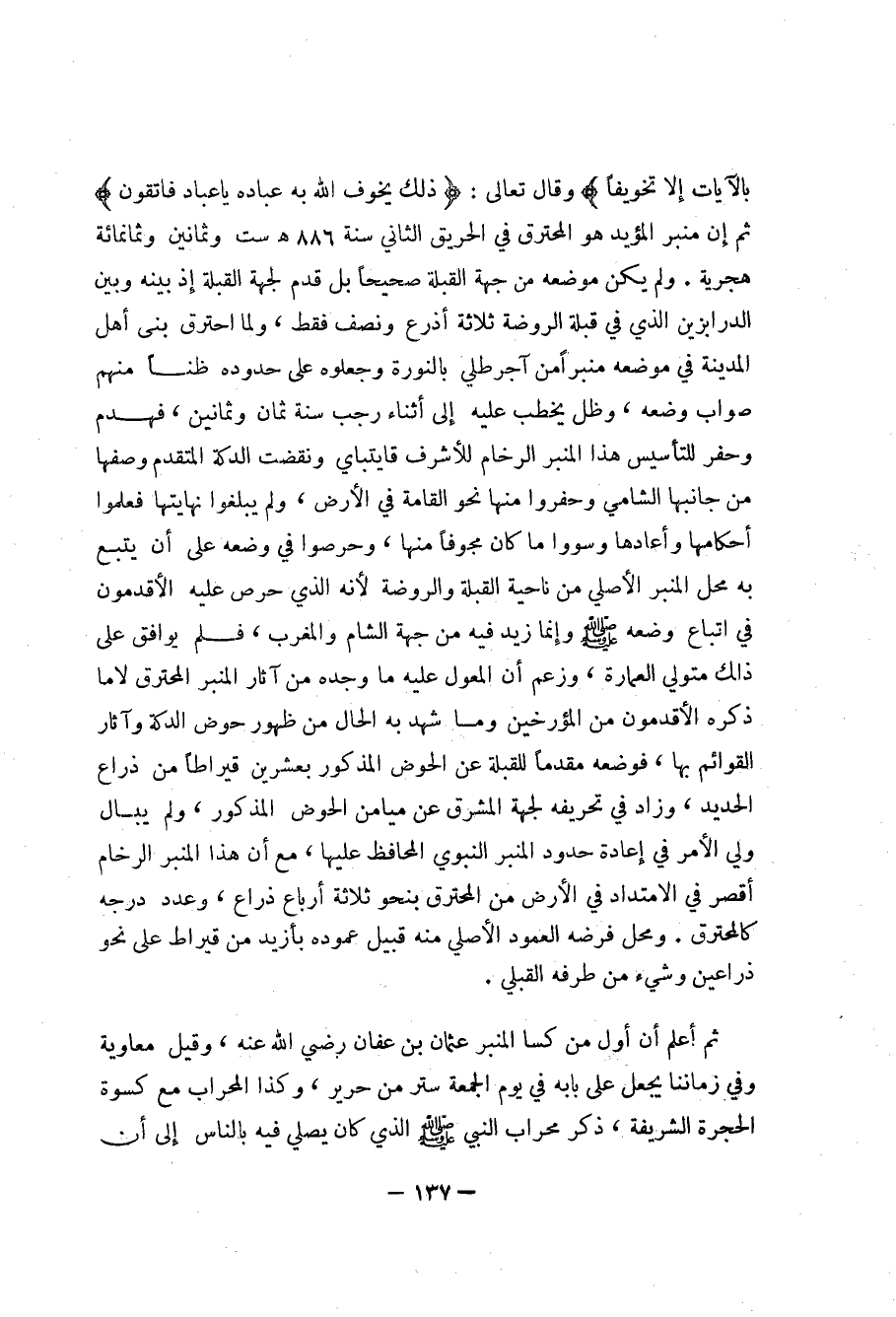 137 ... بالآيات إلا تخويفاً) وقال تعالى: (ذلك يخوف الله به عباده يا عباد فاتقون) ثم إن منبر المؤيد هو المحترق في الحريق الثاني سنة 886هـ ست وثمانين وثمانمائة هجرية.