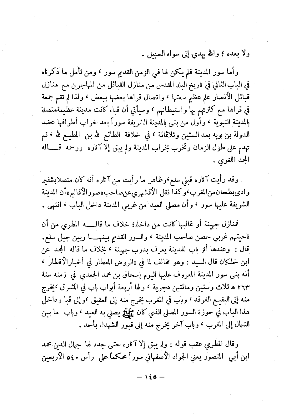 وقد رأيى آثاره قبلي سلع، وظاهر ما رأيت من آثاره أنه كان متصلا بشفير وادى بطحان من المغرب، وكذا نقل الأقشهري عن صاحب (صور الأقاليم) أن المدينة الشريفة عليها سور، وأن مصلى العيد من غربي المدينة داخل الباب، انتهى.
