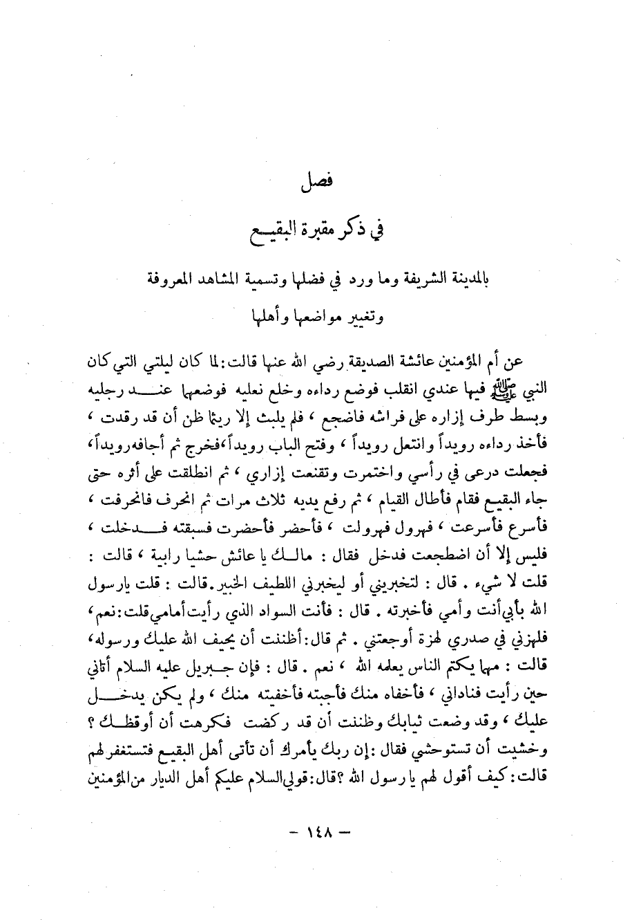 فصل في ذكر مقبرة البقيع بالمدينة الشريفة وما ورد في فضلها وستمية المشاهد المعروفة وتغيير مواضعها وأهلها عن أم المؤمنين عائشة الصديقة رضي الله عنها قالت: لما كان ليلتي التي كان النبي صلى الله عليه وسلم فيها عندي انقلب موضع رداؤه وخلع نعليه فوضعهما عند رجليه وبسط طرف إزاره على فراشه فاضجع، فلم يلبث إلا ريثما ظن أن قد رقدت، فأخذ ردائه رويداً رويداً وانتعل رويداً، فخرج ثم أجافه رويداً، فجعلت درعى في رأسي واختمرت وتقنعت إزاري، ثم انطلقت على أثره حتى جاء البقيع فقام فأطال القيام، ثم رفع يديه ثلاث مرات ثم انحرف غانحرفت، فأسرع فأسرعت، فهرول فهرولت، فأحضر فأحضرت فسبقته فدخلت، فليس إلا أن اضطجعت فدخل فقال: مالك يا عائش حشيا رابية، قالت: قات لا شيء. قال: لتخبرني أو ليخربني اللطيف الخبير. قالت: قلت يا رسول الله بأبي أنت وأمي فأخبرته. قال: فأنت السواد الذي رأيت أمامي قلت: نعم، فلهزني في صدري لهزة أوجعتني. ثم قال: أظننت أن يحيف الله عليك ورسوله، قالت: مهما يكتم الناس يعلمه الله، قال: فإن جبريل عليه السلام أتاني حين رأيت فناداني، فأخفاه منك فأجبته فأخفيته منك، ولم يكن يدخل عليك، وقد وضعت ثيابك وظننت أن قد ركضت فكرهت أن أوقظك؟ وخشيت أن تستوحشني فقال: إن ربك يأمرك أن تأتي أهل البقيع فستغفر لهم قال: كيف أقول لهم يا رسول الله؟ قال: قولي السلام عليكم أهل الديار من المؤمنين ...