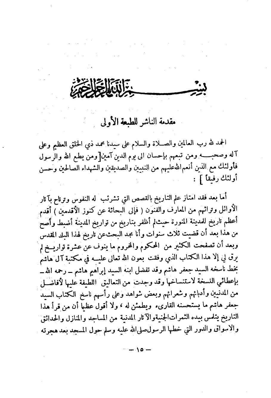 أما بعد فقد امتاز علم التاريخ بالقصص التي تشرئب له النفوس وترتاح بآثار الأوائل وتراثهم من المعارف والفنون (فإلى البحاثة عن كنوز الأقدمين) أقدم أعظم تاريخ للمدينة المورة حيث لم أظفر بتاريخ من تواريخ المدينة أضبط وأصح من هذا بعد أن قضيت ثلاث سنوات وأنا مجد البحث عن تاريخ لهذا البلد المقدس وبعد أن تصفحت الكثير من المحكوم وما ينوف عن شعرة تواريخ لم يرق لي إلا هذا الكتاب الذي وفقت بعون الله تعالى عليه في مكتبة آل هاشم بخط ناسخه السيد جعفر هاشم وقد تفضل ابنه السيد إبراهيم هاشم - رحمه الله - بإعطائي النسخة لاستنساخها وقد وجدت من التعاليق اللطيفة عليها لأفاضل من المدنيين وأدبائهم وشعرائهم وبعض شواهد وعلى رأسهم ناسخ الكتاب السيد جعفر هاشم ما يستحسنه القارئ ويطمئن له، ولا أقول عظيما أن من قرأ هذا التاريخ يتلمس بيده الثمرات الجنية والآثار المدينة من المساجد والمنازل والحدائق والاسواق والدور التي خطها الرسول صلى الله عليه وسلم حول المسجد بعد هجرته
