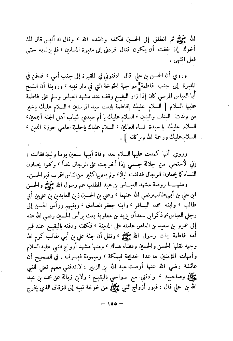 وروي أن الحسن بن علي قال ادفنوني في المقبرة إلى جنب أمي، فدفن في المقبرة إلى جنب فاطمة مواجهة الخوخة التي في دار نبيه، وروينا أن الشيخ أبا العباس المرسي كان إذا زار البقيع وقف عند مشهد العباس وسلم على فاطمة عليها السلام [السلام عليك يا فاطمة يا بنت سيد المرسلين، السلام عليك يا خير من ولدت البنات والبنين، السلام عليك يا أم سيدي شباب أهل الجنة أجمعين، السلام عليك يا سيدة نساء العالمين، السلام عليك يا حليلة حامي حوزة الدين، السلام عليك ورحمة الله وبركاته].