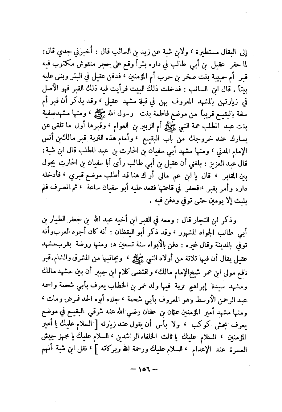 156 ... إلى القفال مستطيرة، ولابن شبة عن زيد بن السائب قال: أخبرني جدي قال: لما حفر عقيل بن أبي طالب في داره بئراً وقع على حجر نقوش مكتوب فيه قبر أم حبيب بنت صخر بن حرب أم المؤمنين، فدفن عقيل في البئر وبنى عليه بيتاً.