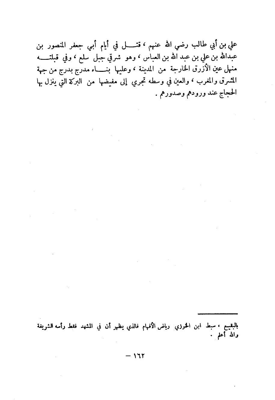 162 ... علي بن أبي طالب رضي الله عنهم، قتل في أيام أبي جعفر المنصور بن عبد الله بن علي بن عبد الله بن العباس، وهو شرقي جبل سلع، وفي قبلته منهل عين الأزرق الخارجة من المدينة، وعليها بناء مدرج يدرج من جهة المشرق والمغرب، والعين في وسطه تجري إلى مفيضها من البركة التي ينزل بها الحجاج عند ورودهم وصدورهم.
