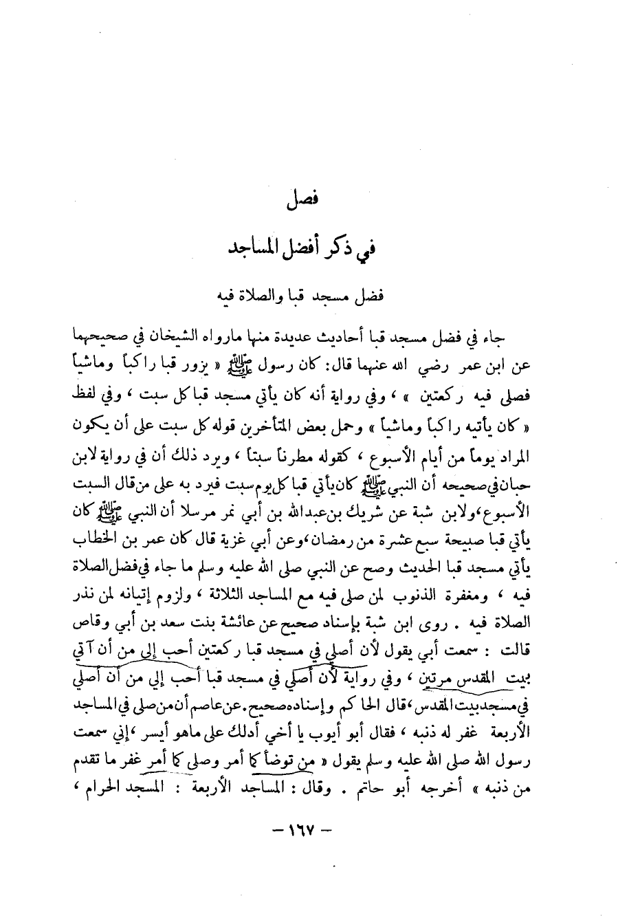 جاء في فصل مسجد قبا أحاديث عديدة منها ما رواه الشيخان في صحيحهما عن ابن عمر رضي الله عنهما قال: كان رسول الله صلى الله عليه وسلم (يزور قبا راكباً وماشياً فصلى فيه ركعتين)، وفي رواية أنه كان يأتي مسجد قبل كل سبت، وفي لفظ (كان يأتيه راكباً وماشياً) وحمل بعض المتأخرين قوله كل سبت على أن يكون المراد يوماً من أيام الأسبوع، كقوله مطرناً سبتاً، ويرد ذلك أن في رواية لابن حبان في صحيحه أن النبي صلى الله عليه وسلم كان يأتي قبا كل سبت فيرد به على من قال السبت الأسبوع، ولابن شبة عن شريك عبد الله بن أبي نمر مرسلا أن النبي صلى الله عليه وسلم كان يأتي قبا صبيحة سبع عشرة من رمضان، وعن أبي غزية قال كان عمر بن الخطاب يأتي مسجد قبا الحديث وصح عن النبي صلى الله عليه وسلم ما جاء في فضل الصلاة فيه، ومغفرة الذنوب لمن صلى فيه مع المساجد الثلاثة، ولزوم إتيانه لمن نذر الصلاة فيه.