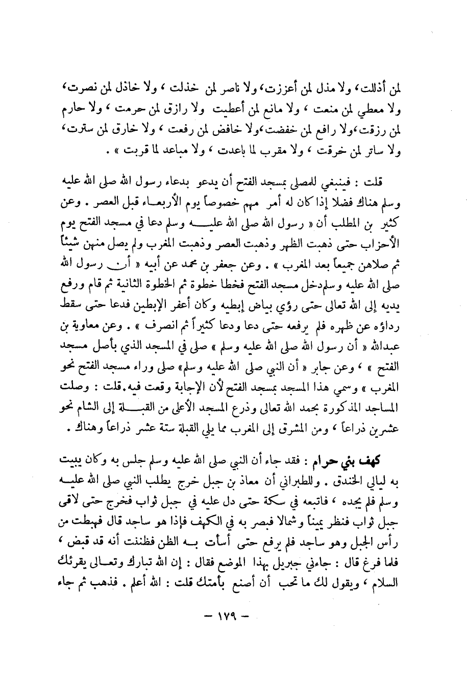 قلت: فينبغي للمصلي بمسجد الفتح أن يدعو بدعاء رسول الله صلى الله عليه وسلم هناك فضلا إذا كان له أمر مهم خصوصاً يوم الأربعاء قبل العصر.