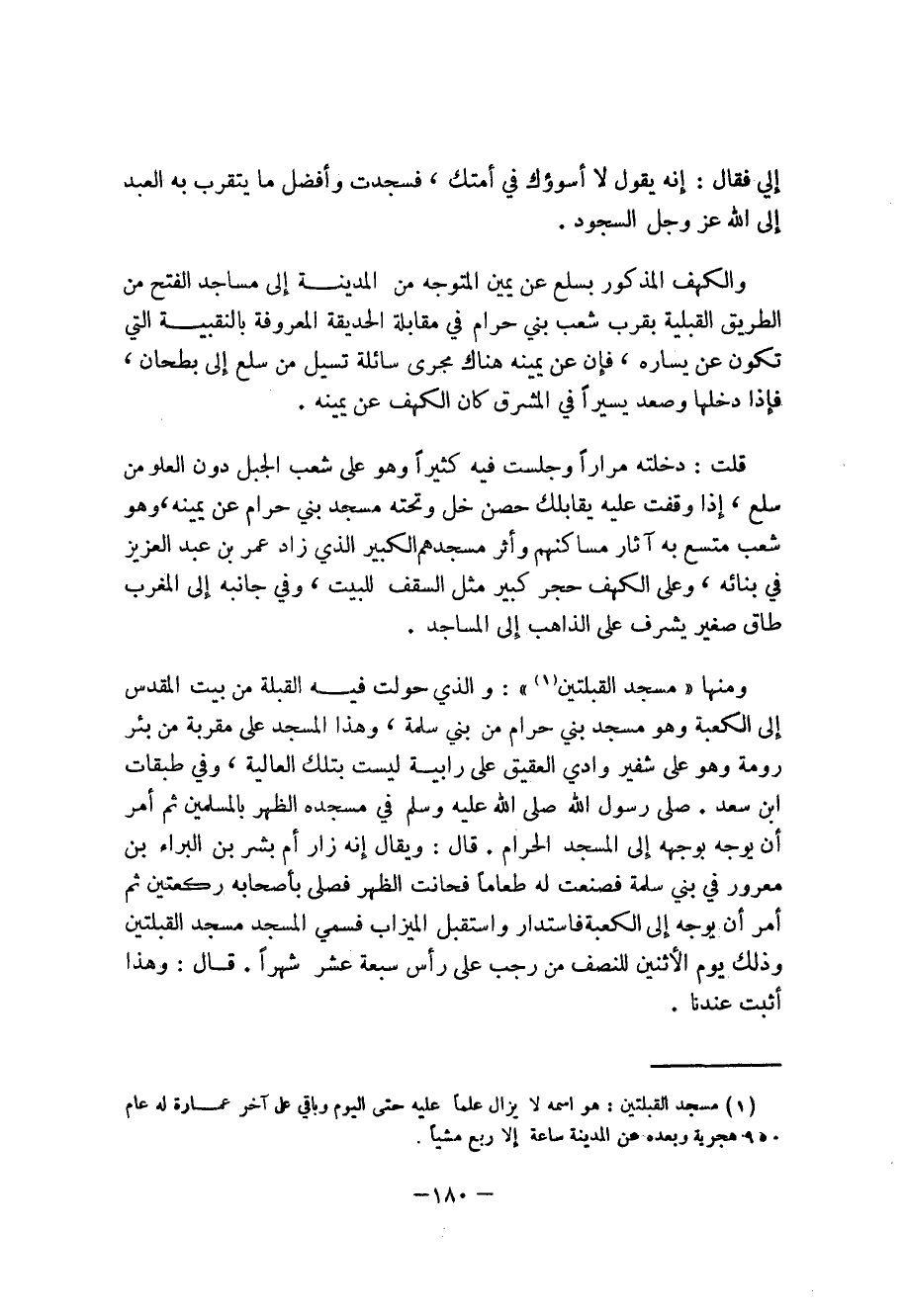 ومنها (مسجد القبلتين) (1): والذي حولت فيه القبلة من بيت المقدس إلى الكعبة وهو مسجد بني حرام من بني سلمة، وهذا المسجد على مقربة من بئر رومة وهو على شفير وادي العقيق على رابية ليست بتلك العالية، وفي طبقات ابن سعد.