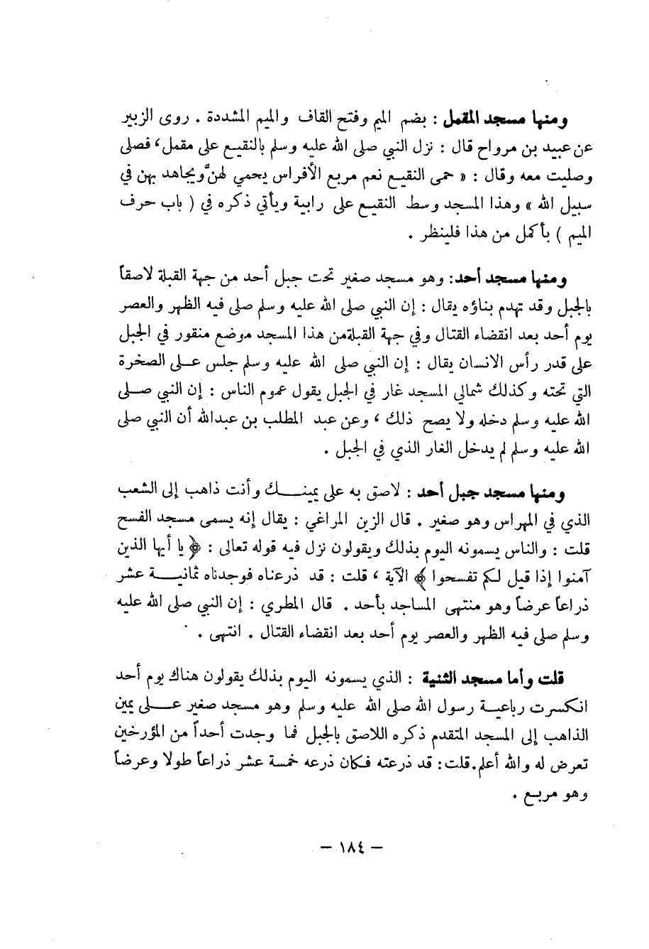 ومنها مسجد جبل أحد: لاصق على يمينك وأنت ذاهب إلى الشعب الذي في المهراس وهو صغير.