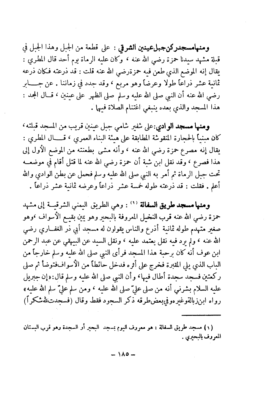 ومنها مسجد طريق السفالة (1): وهي الطريق اليمني الشرقية إلى مشهد حمزة رضي الله عنه قرب النخيل المعروفة بالبحير وهو يمين بقيع الأسواف، وهو صغير متهدم طوله ثمانية أذرع والناس يقولون له مسجد أبي ذر الغفاري رضي الله عنه، ولم يرد فيه نقل يعتمد عليه، ونقل السيد عن البيهقي عن عبد الرحمن ابن عوف أنه كان برحبة هذا المسجد فرأى النبي صلى الله عليه وسلم خارجاً من الباب الذي يلي المقبرة فخرج على أثره فدخل حائطاً من الأسواف فتوضأ ثم صلى ركعتين فسجد سجدة أطال فيها، وأن النبي صلى الله عليه وسلم قال: (إن جبريل عليه السلام بشرني أنه من صلى عليّ صلى الله عليه، ومن سلم عليّ الله عليه) رواه ابن زبالة وغيره وفي بعض طرقه ذكره السجود فقط وقال (فسجدت لله شكراً) ...