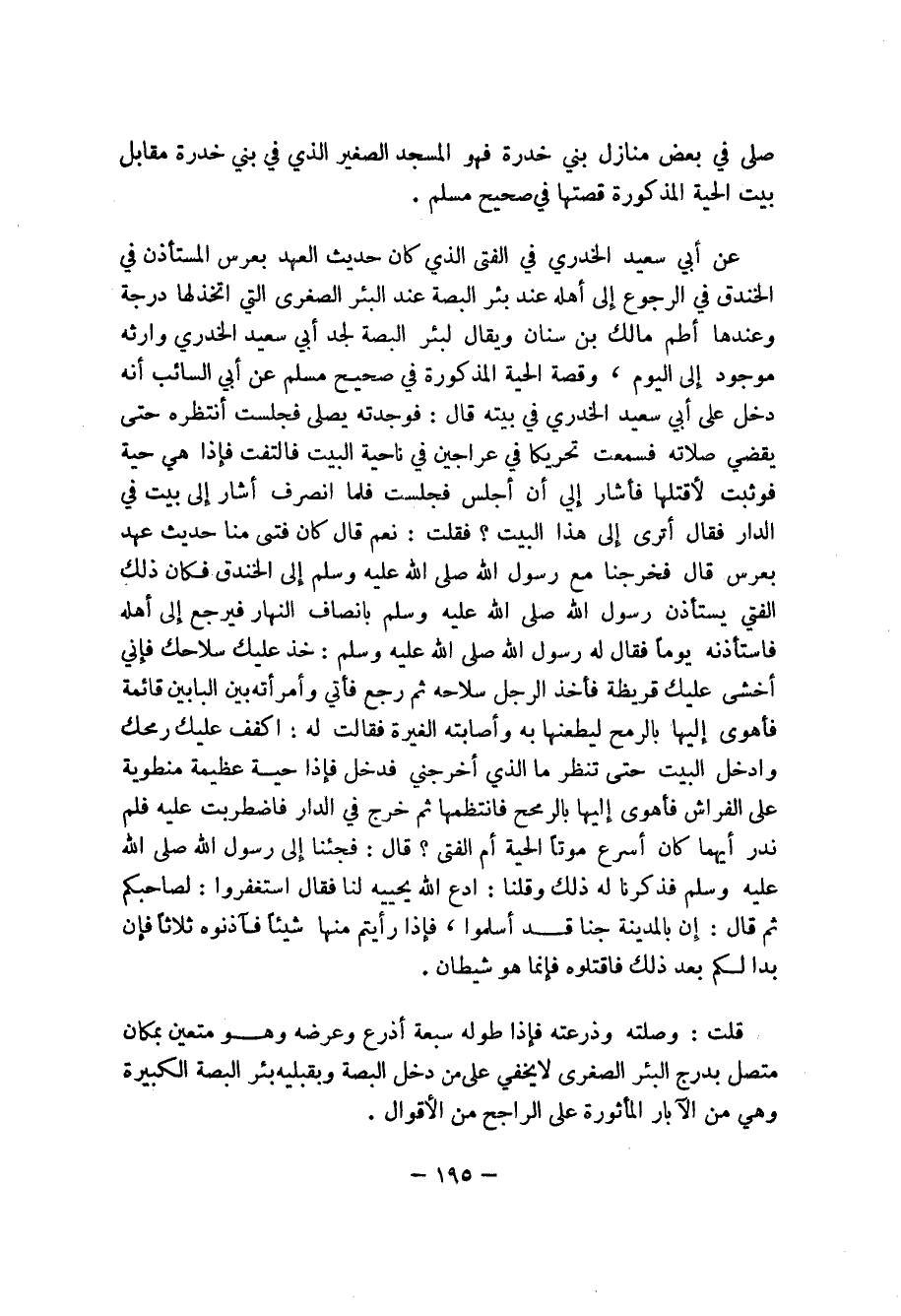 عن أبي سعيد الخدري في الفتى الذي كان حديث العهد بعرس المستأذن في الخندق في الرجوع إلى أهله عند البئر الصغرى التي اتخذ لها درجة وعندها أطم مالك بن سنان ويقال لبئر البصة لجد أبي سعيد الخدري وارثه موجود إلى اليوم، وقصة الحية في صححي مسلم عن أبي السائب أنه دخل على أبي سعيد الخدري في بيته قال: فوجدته يصلى فجلست أنتظره حتى يقضي صلاته فسمعت تحريكا في عراجين من ناحية البيت فالتقت فإذا هي حية فوثبت لأقتلها فأشار إلي أن اجلس فجلست فلما انصرف أشار إلى بيت في الدار فقال أترى إلى هذا البيت؟ فقلت: نعم قال كان فتى منا حديث عهد بعرس قال فخرجنا مع رسول الله صلى الله عليه وسلم بانصاف النهار فيرجع إلى أهله فاستأذنه يوماً فقال له رسول الله صلى الله عليه وسلم: خذ عليك سلاحك فإني أخشى عليك قريظة فأخذ الرجل سلاحه ثم رجع فأتي وأمرأته بين البابين قائمة فأهوى إليها بالرمح ليطعنها به واصابته الغيرة فقالت له: اكفف عليك رمحك وادخل البيت حتى تنظر مال الذي أخرجني فدخل فإذا حية عظيمة منطوية على الفراش فأوهى إليها بالرمح فانتظمها ثم خرج في الدار فاضطربت عليه فلم ندر أيهما كان أشرع موتاً الحية أم الفتى؟ قال: فجئنا إلى رسول الله صلى الله عليه وسلم فذكرنا له ذلك وقلنا: ادع الله يحييه لنا فقال استغفروا: لصاحبكم ثم قال: إن بالمدينة جنا قد أسلموا، فإذا رأيتم منها شيئاً فآذنوه ثلاثاً فإن بدا لكم بعد ذلك فاقتلوه فإنما هو شيطان.