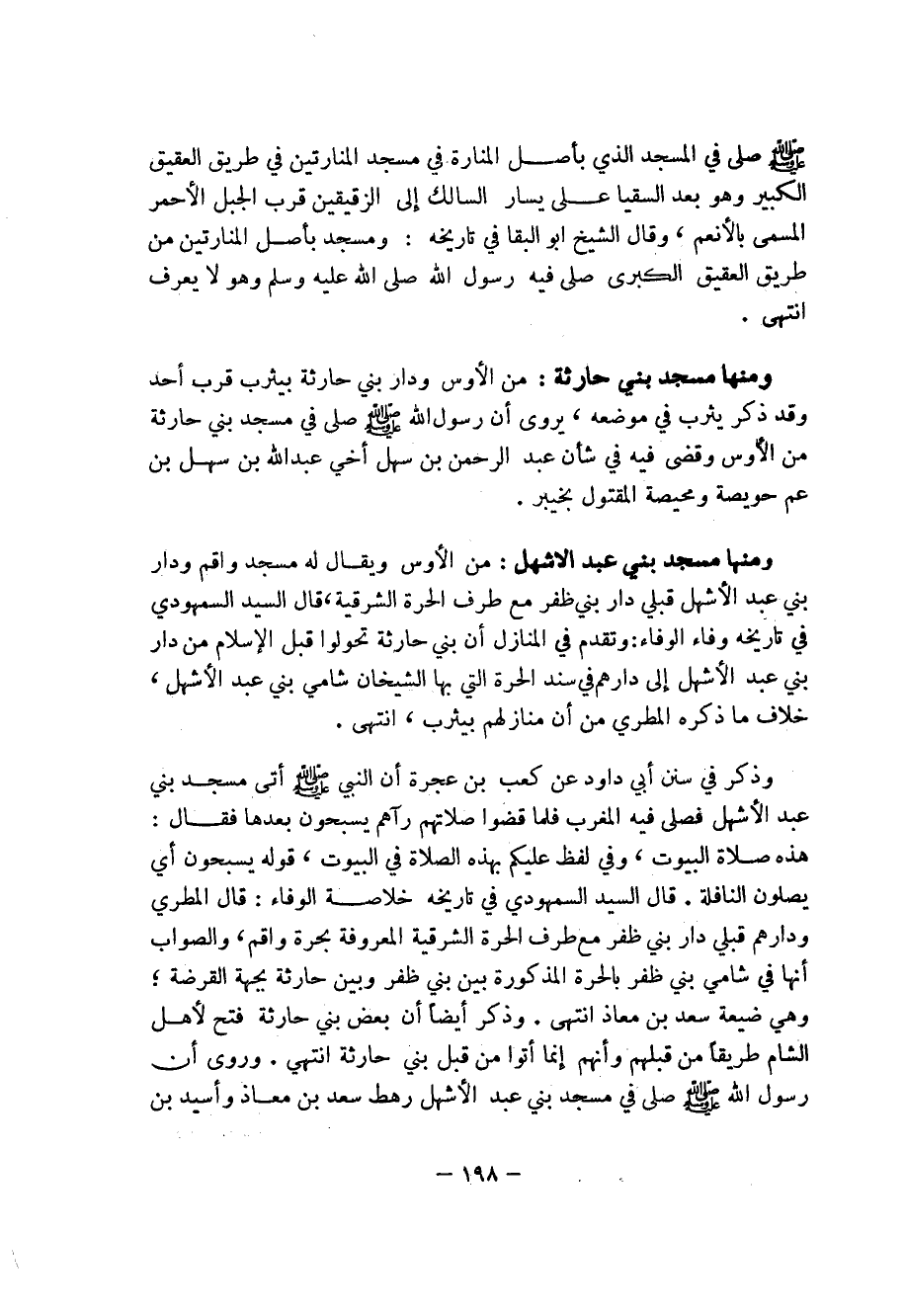198 ... صلى الله عليه وسلم صلى في المسجد الذي بأصل المنارة في مسجد المنارتين في طريق العقيق الكبير وهو بعد السقيا على يسار السالك إلى الزقيقين قرب الجبل الأحمر المسمى بالأنعم، وقال الشيخ ابو البقا في تاريخه: ومسجد بأصل المنارتين من طريق العقيق الكبرى صلى فيه رسول الله صلى الله عليه وسلم وهو لا يعرف انتهى.