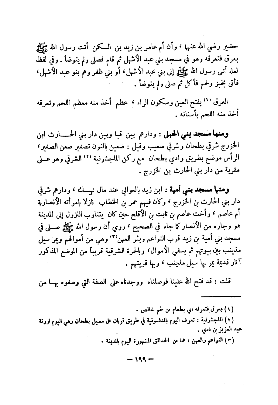 ومنها مسجد بني أمية: ابن زيد بالعوالي عند مال نهيك، ودارهم شرقي دار بني الحارث بن الخزرج، وكان فيهم عمر بن الخطاب نازلا بامرأته الأنصارية أم عاصم، وأخت عاصم بن ثابت بن الأفلح حين كان يتناوب النزول إلى المدينة هو وجاره من الأنصار كما جاء في الصحيح، روي أن رسول الله صلى الله عليه وسلم صلى في مسجد بني أمية بن زيد قرب النواعم وبئر العهن (3) وهي من أموالهم ويمر سيل مذينب بين بيوتهم ثم يسقي الأموال، وبالحرة الشرقية قريباً من الموضع المذكور آثار قديمة يمر بها سيل مذينب، وبها قريتهم.