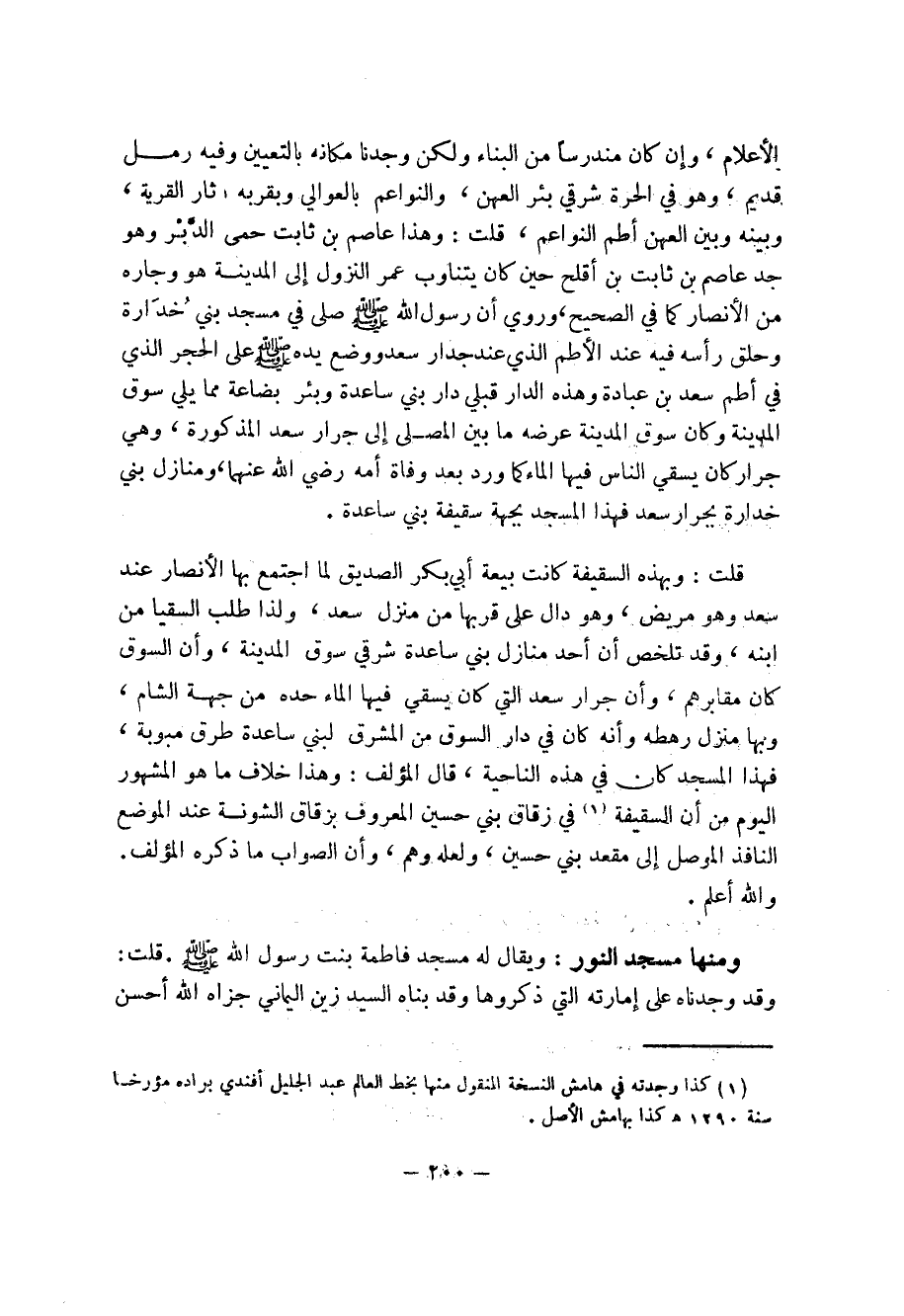 قلت: وبهذه السقيفة كانت بيعة أبي بكر الصديق لما اجتمع بها الأنصار عند سعد وهو مريض، وهو دال على قربها من منزل سعد، ولذا طلب السقيا من ابنه، وقد تلخص أن أحد منازل بني ساعدة شرقي سوق المدينة، وأن السوق كان مقابرهم، وأن جرار سعد اليت كان يسقي فيها الماء حده من جهة الشام، وبها منزل رهطه وأنه كان في دار السوق من المشرق لبني ساعدة طرق مبوبة، فذها المسجد كان في هذه الناحية، قال المؤلف: وهذا خلاف ما هو المشهور اليوم من أن السقيفة (1) في زقاق بني حسين المعروف بزقاق الشونة عند الموضع النافذ الموصل إلى مقعد بني حسين، ولعله وهم، وأن الصواب ما ذكره المؤلف.