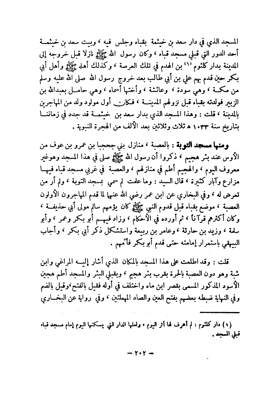 (1) دار كلثوم: لم أعرف لها أثر اليوم، ولعلها الدار التي يسكنها اليوم إمام مسجد قباء قبلي المسجد.