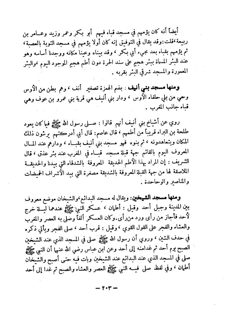 203 ... أيضاً أنه كان يؤمهم في مسجد قباء فيهم أبو بكر وعمر وزيد وعامر بن ربيعة، قلت: وقد يقال في التوفيق إنه كان أولا يؤمهم في مسجد التوبة بالعصبة، ثم يؤمهم بقباء بعد مجيء أبي بكر، وقد بيناه وعينا مكانه ووجدنا أساسه وهو عند البئر المسامة ببئر هجيم على سند الحرة دون أطم هجيم الموجود اليوم، والبئر المعمورة والمسجد شرقي البئر بقربه.