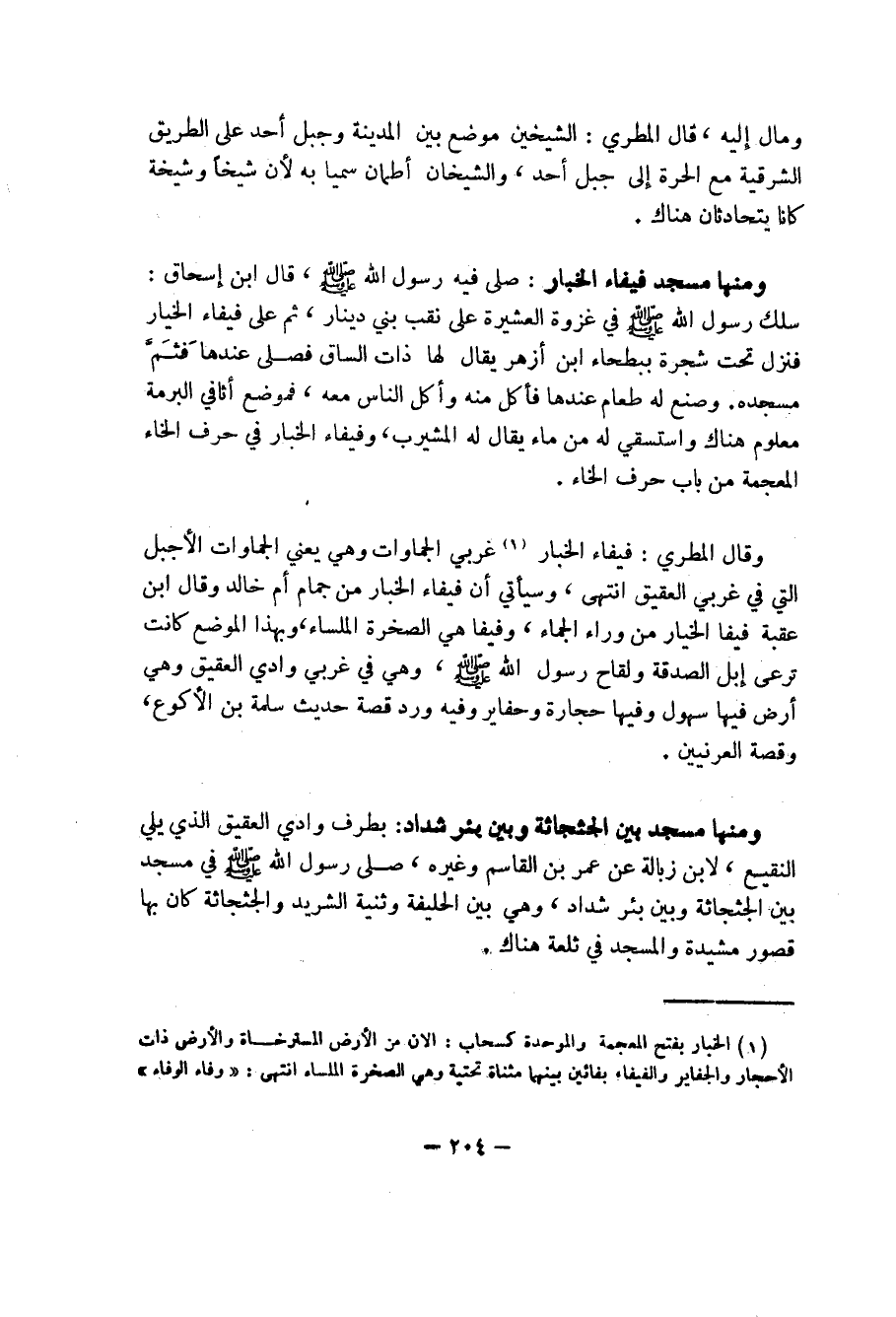 204 ... ومال إليه، قال المطري: الشيخين موضع بني المدينة وجبل أحد على الطريق اشلرقية مع الحرة إلى جبل أحد، والشيخان أطمان سميا به لأن شيخاً وشيخة كانا يتحادثان هناك.