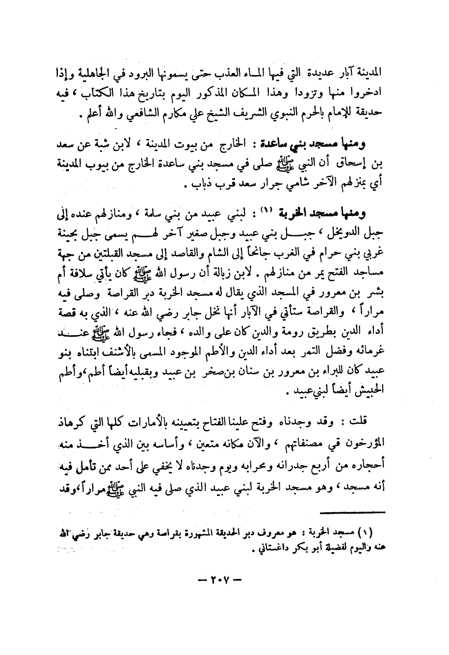 قلت: وقد وجدناه وفتح علينا الفتاح بتعيينه بالأمارات كلها التي ذكرها المؤرخون في مصنفاتهم، والآن مكانه متعين، وأساسه بين الذي أخذ منه أحجاره من أربع جدرانه ومحرابه ويوم وجدناه لا يخفي على أحد ممن تأنل فيه أنه مسجد، وهو مسجد الخربة لبني عبيد الذي صلى فيه النبي صلى الله عليه وسلم مراراً، وقد ...