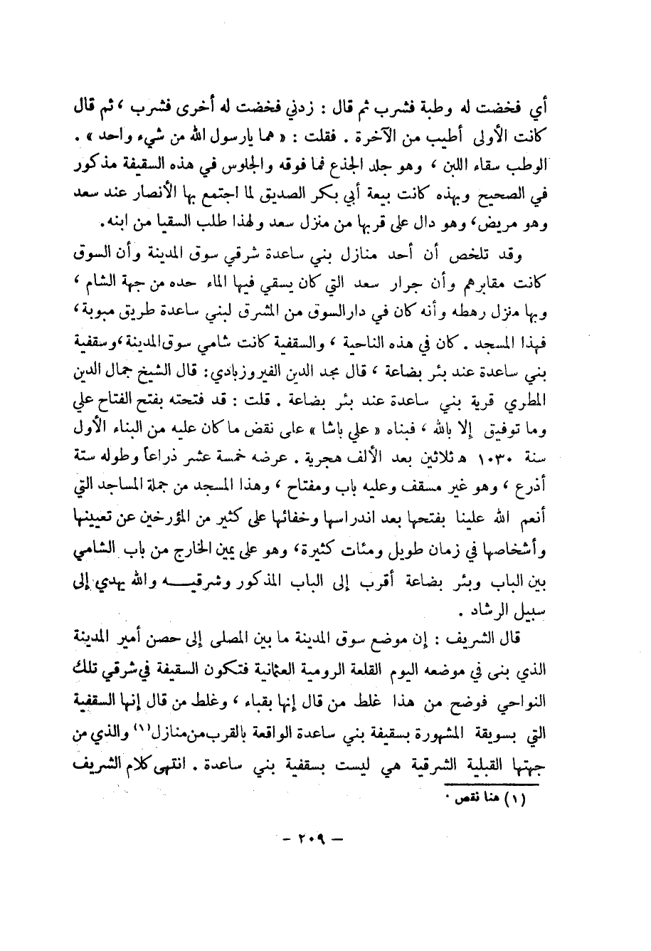 209 ... أي فخضت له وطبة فشرب ثم قال: زدني فخضت له أخرى فشرب، ثم قال كانت الأولى أطيب من الآخرة. فقلت: (هما يا رسول الله من شيء واحد). الرطب سقاء اللبن، وهو جلد الجذع فما فوقه والجلوس في هذه السقيفة مذكور في الصحيح وبهذه كانت بيعة أبي بكر الصديق لما اجتمع بها الأنصار عند سعد وهو مريض، وهو دال على قربها من منزل سعد ولهذا طلب السقيا من ابنه.