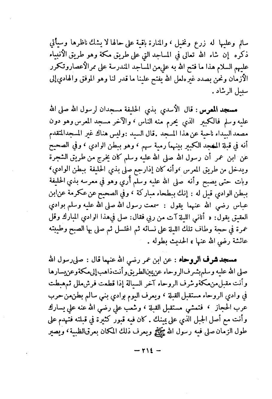 214 ... سالم وعليها له زرع ونخيل، والمنارة باقية على حالها لا يشك ناظرها وسيأتي ذكره إن شاء الله تعالى في المساجد التي على طريق مكة وهو طريق الأنبياء عليهم السلام هذا ما فتح الله به علي من المساجد المندرسة على ممر الأعصار وتكرر الأزمان ونحن بصدد غيره لعل الله يفتح علينا ما قدر لنا وهو الموفق والهادي إلى سبيل الرشاد.