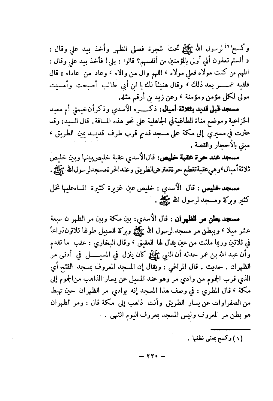 220 ... وكسح (1) لرسول الله صلى الله عليه وسلم تحت شجرة فصلى الظهر بيد علي وقال: (ألستم تعلمون أني اولى بالمؤمنين من انفسهم؟ قالوا: بلى! فأخذ بيد علي وقال: اللهم من كنت مولاه فعلي مولاه، اللهم وال من والاه، وعاد من عاداه) قال فلقيه عمر بعد ذلك، وقال هنيئاً لك يا بن أبي طالب أصبحت وأمسيت مولى لكل مؤمن ومؤمنة، وعن زيد بن أرقم مثله.