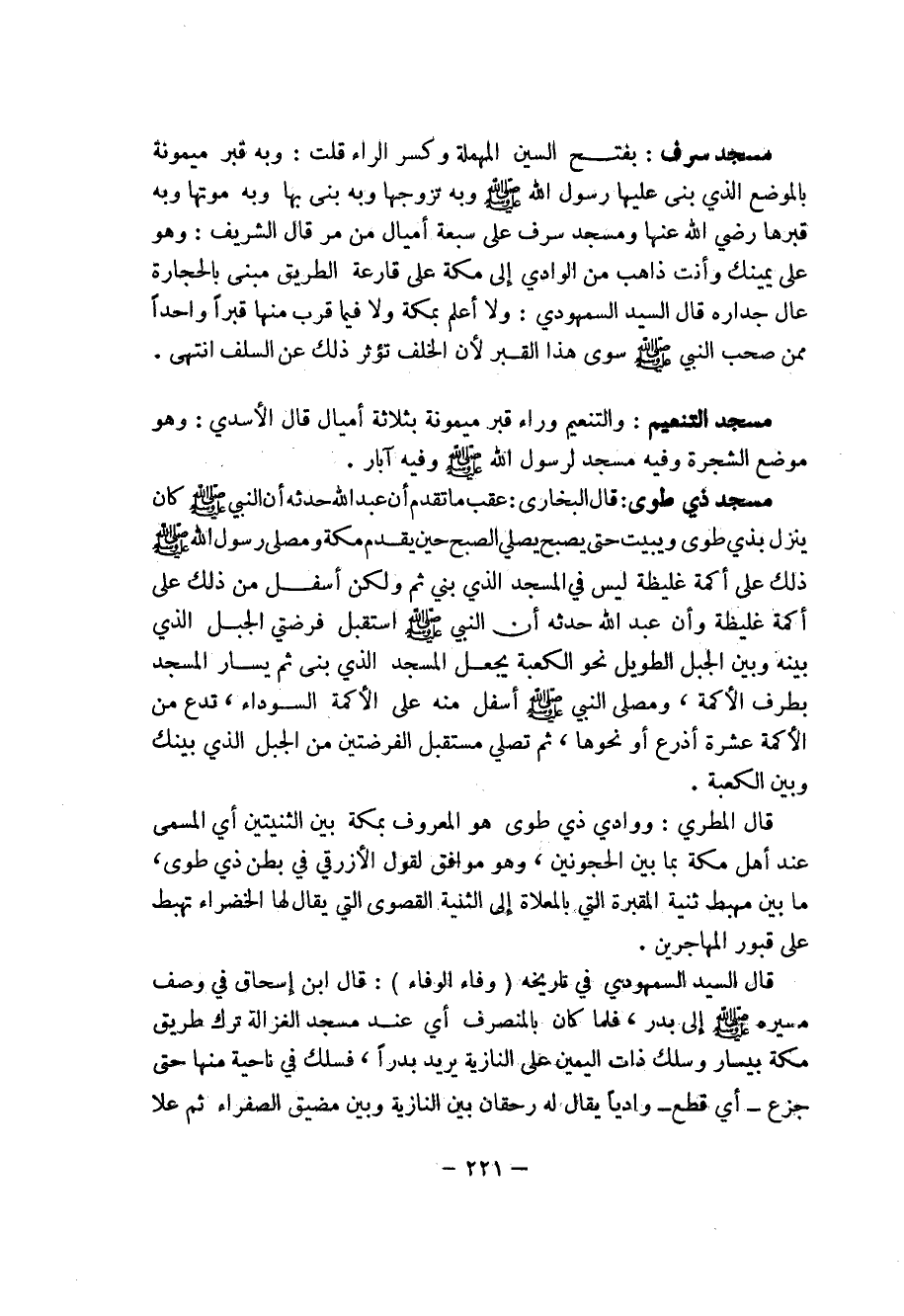 مسجد ذي طوى: قال البخارى: عقب ما تقدم أن عبدالله حدثه أن النبي صلى الله عليه وسلم كان ينزل بذى طوى ويبيت حتى يصبح يصلي الصبح حين يقدم مكة ومصلى رسول الله صلى الله عليه وسلم ذلك على أكمة غليظة ليس في المسجد الذي بني ثم ولكن أسفل من ذلك على أكمة غليظة وأن عبدالله حدثه أن النبي صلى الله عليه وسلم استقبل فرضني الجبل الذي بينه وبين الجبل الطويل محو الكعبة يجعل المسجد الذي بنى ثم يسار المسجد بطرف الأكمة، ومصلى النبي صلى الله عليه وسلم أسفل منه على الأكمة السوداء، تدع من الأكمة عشرة أذرع أو نحوها، ثم تصلي مستقبل الفرضتين من الجبل الذي بينك وبين الكعبة.