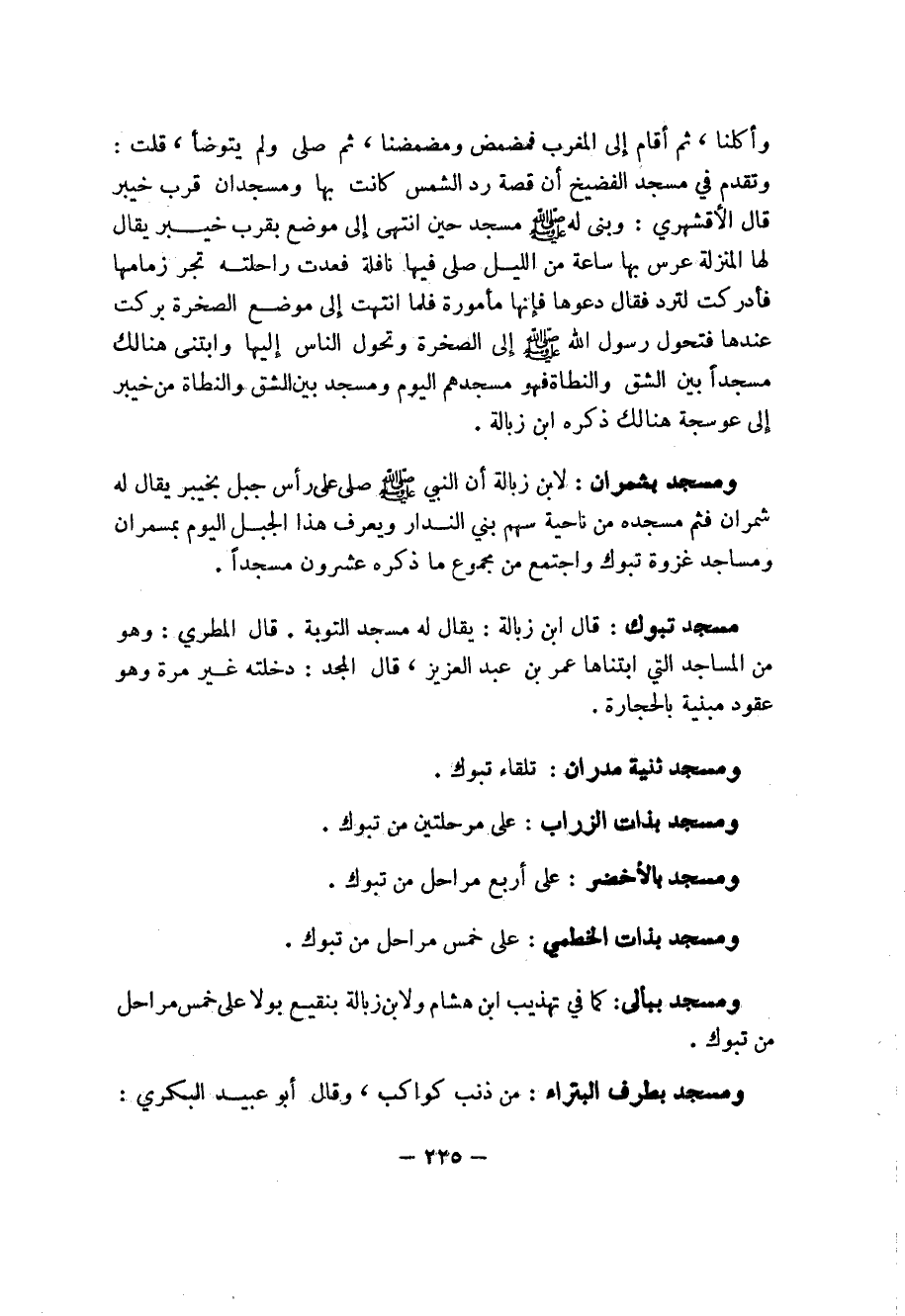 ومسجد بشمران: لابن زبالة أن النبي صلى الله عليه وسلم صلى على رأس جبل بخيبر يقال له شمران فثم مسجده من ناحية سهم بني الندار ويعرف هذا الجبل اليوم بمسمران وماسجد غزوة تبوك واجتمع من مجموع ما ذكره عشرون مسجداً.