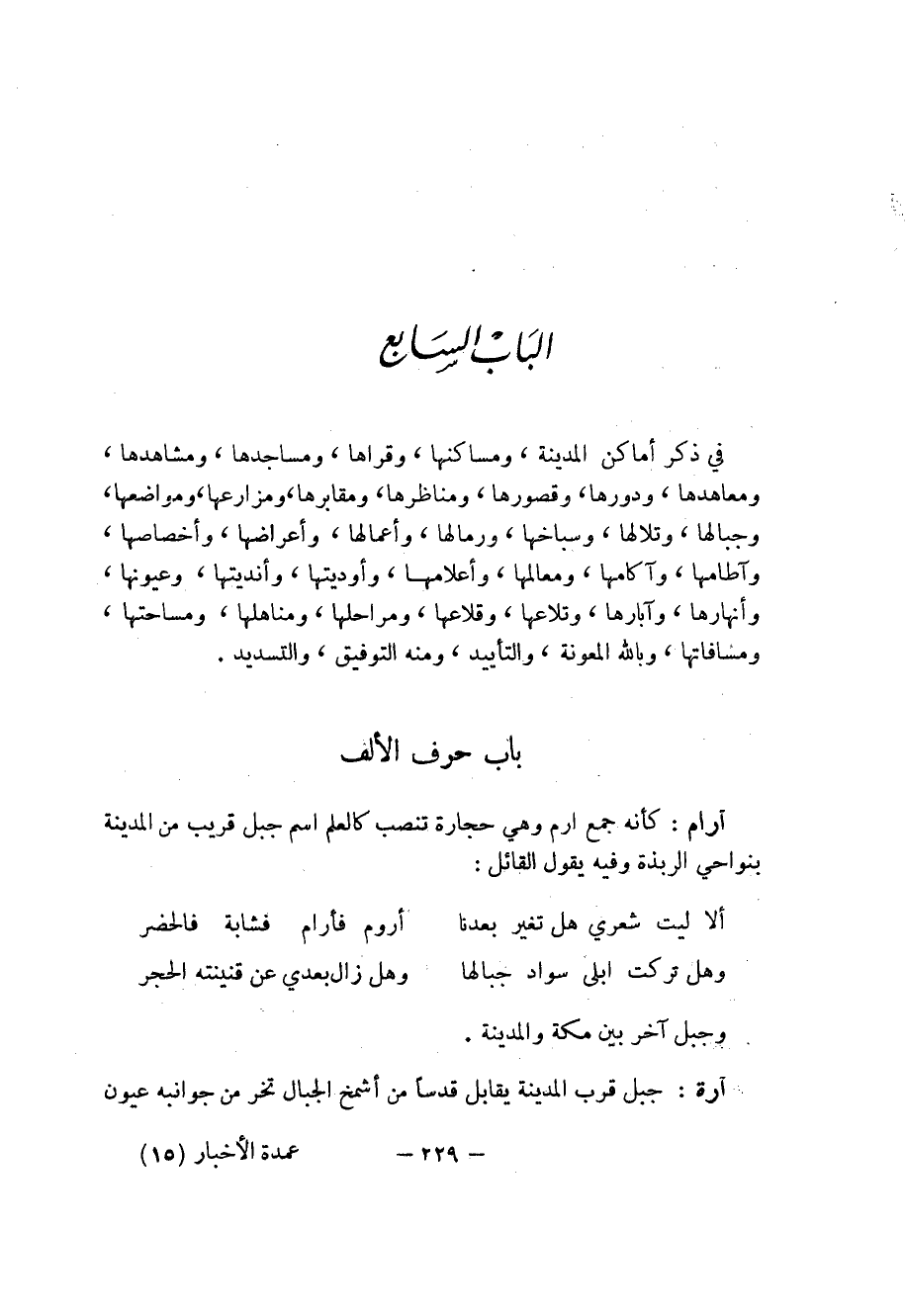 الباب السابع في ذكر أماكن المدينة، ومساكنها، وقراها، ومساجدها، ومشاهدها، ومعاهدها، ودورها، وقصورها، ومناظرها، ومقابرها، ومزارعها، ومواضعها، وجبالها، وتلاها، وسباخها، ورمالها، وأعمالها، وأعراضها، وأخصاصها، وآطامها، وآكامها، ومعالمها، وأعلامها، وأوديتها، وأنديتها، وعيونها، وأنهارها، وآبارها، وتلاعها، وقلاعها، ومراحلها، ومناهلها، ومساحتها، ومسافاتها، وباله المعونة، والتأييد، ومنه التوفيق، والتسديد.