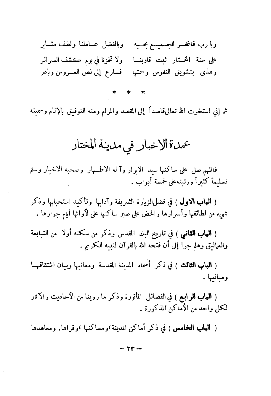 فاللهم صل على ساكنها سيد الابرار وآله الاطهار وصحبه الاخيار وسلم تسليماً كثيراً ورتبته على خمسة أبواب.