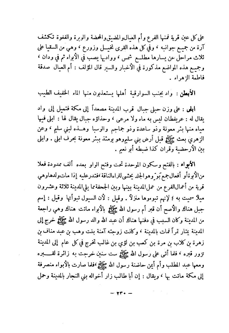 230 ... على كل عين قرية فمنها الفرع وأم العيال والمضيق والمحضة والوبرة والغفوة تكشف آرة من جميع جوانبه، وفي كل هذه القرى نخيل وزروع وهي من السقيا على ثلاث مراحل عن يسارها مطلع شمس، وواديها يصب في الأبواء ثم في ودان، وجميع هذه المواضع مذكورة في الأخبار والسير قال المؤلف: أم العيال صدقة فاطمة الزهراء.