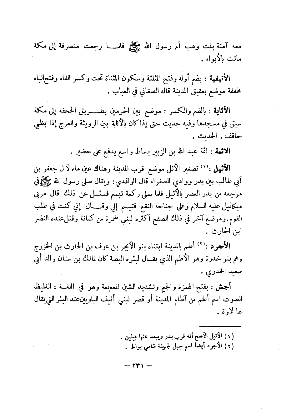 231 ... معه آمنة بنت وهب أم رسول الله صلى الله عليه وسلم فلما رجعت منصرفة إلى مكة ماتت بالأبواء.