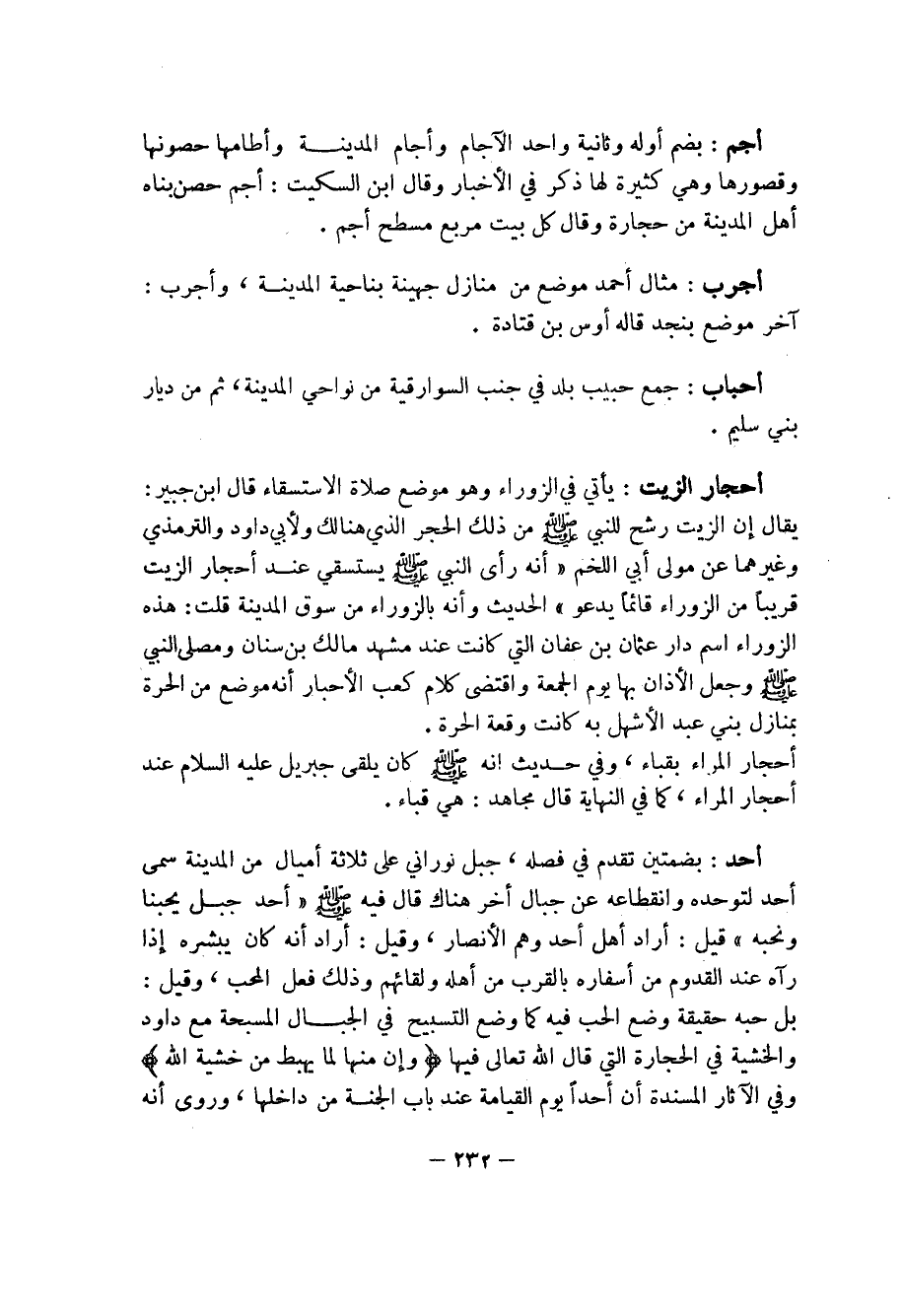 232 ... أجم: بضم أوله وثاية واحد الآجام وآجام المدينة وأطامها حصونها وقصورها وهي كثيرة لها ذكر في الأخبار وقال ابن السكيت: أجم حصن بناه أهل المدينة من حجارة وقال كل بيت مربع مسطح أجم.