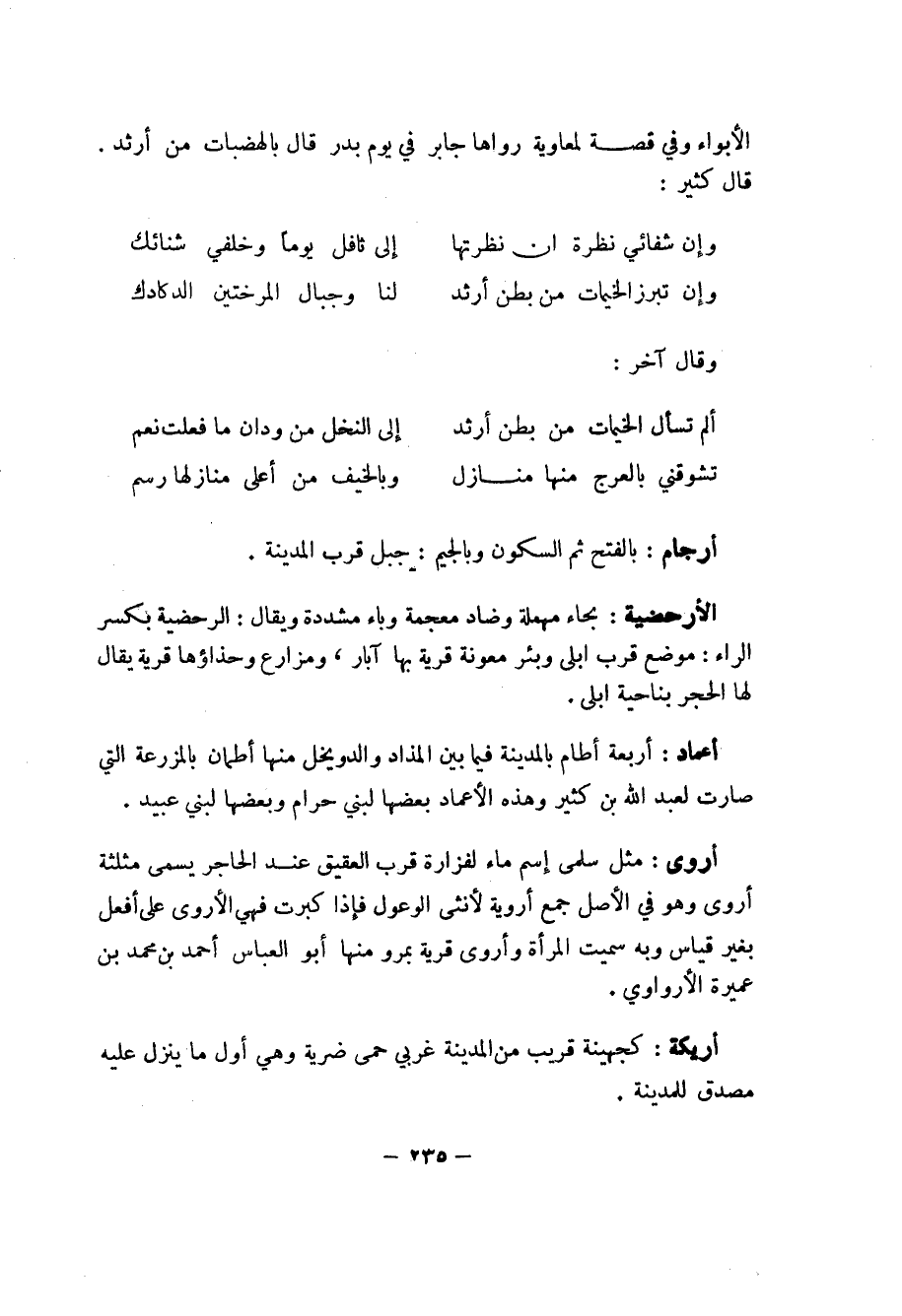 235 ... الأبواء وفي قصة لمعاوية رواها جبار في يوم بدر قال بالهضبات من أرثد.
