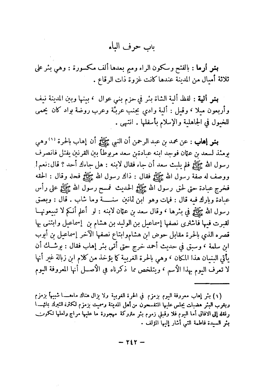 قال: وبصق رسول الله صلى الله عليه وسلم في بئرها، وقال سعد بن عثمان لابنه: لو أعلم أنكم لا تبيعونها لقبرت فيها فاشترى نصفها إسماعيل بن الولد بن هشام بن إسماعيل وابتنى بها قصره الذي بالحرة مقابل حوض ابن هشام وابتاع نصفها الآخر إسماعيل بن أيوب ابن سلمة، وسبق في حديث أحمد خرج حتى أتى بئر إهاب فقال: يوشك أن يأتي البنيان هذا المكان، وهي بالحرة الغربية كما يؤخذ من كلام ابن زبالة غير أنها لا تعرف اليوم بهذا الإسم، ويتلخص مما ذكرناه في الأصل أنها المعروفة اليوم ...