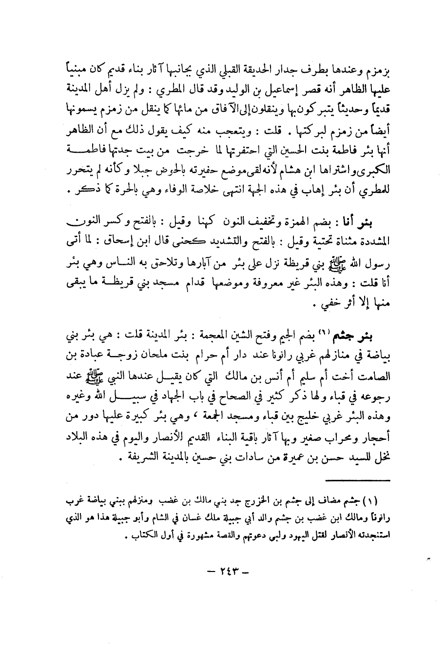 243 ... بزمزم وعندها بطرف جدار الحديقة القبلى الذي بجانبها آثار بناء قديم كان مبنياً عليها الظاهر أنه قصر إسماعيل بن الوليد وقد قال المطري: ولم يزل أهل المدينة قديماً وحديثاً يتبركون بها وينقلون إلى الآفاق من مائها كما ينقل من زمزم يسمونها أيضاًمن زمزم لبركتها.