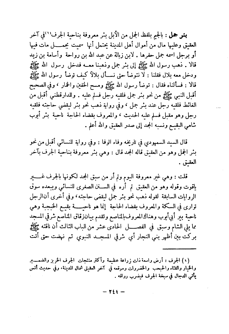 قلت: وهي غير معروفة اليوم ولم أر من سبق المجد لكونها بالجرف غير ياقوت وقوله من العقيق لم أره في السنن الصغرى للنسائي ويبعده سوق الروايات السابقة لقوله ذهب نحو بئر جمل ليقضى حاجته، وفي أخرى أن الرجل توارى في السكة والمعروف بقضاء الحاجة إنما هو ناحية بقيع الخبجبة وهي ناحية بئر أبي أيوب وهناك المعروف بالمناصع وتقدم بيان زقاق المناصع شرقي المسجد مما يلي الشام وسبق في الفصل الحادى عشر من الباب الثالث أن ناقته صلى الله عليه وسلم بركت بين أظهر بني النجار أي شرقي المسجد النبوي ثم نهضت حتى أتت ...