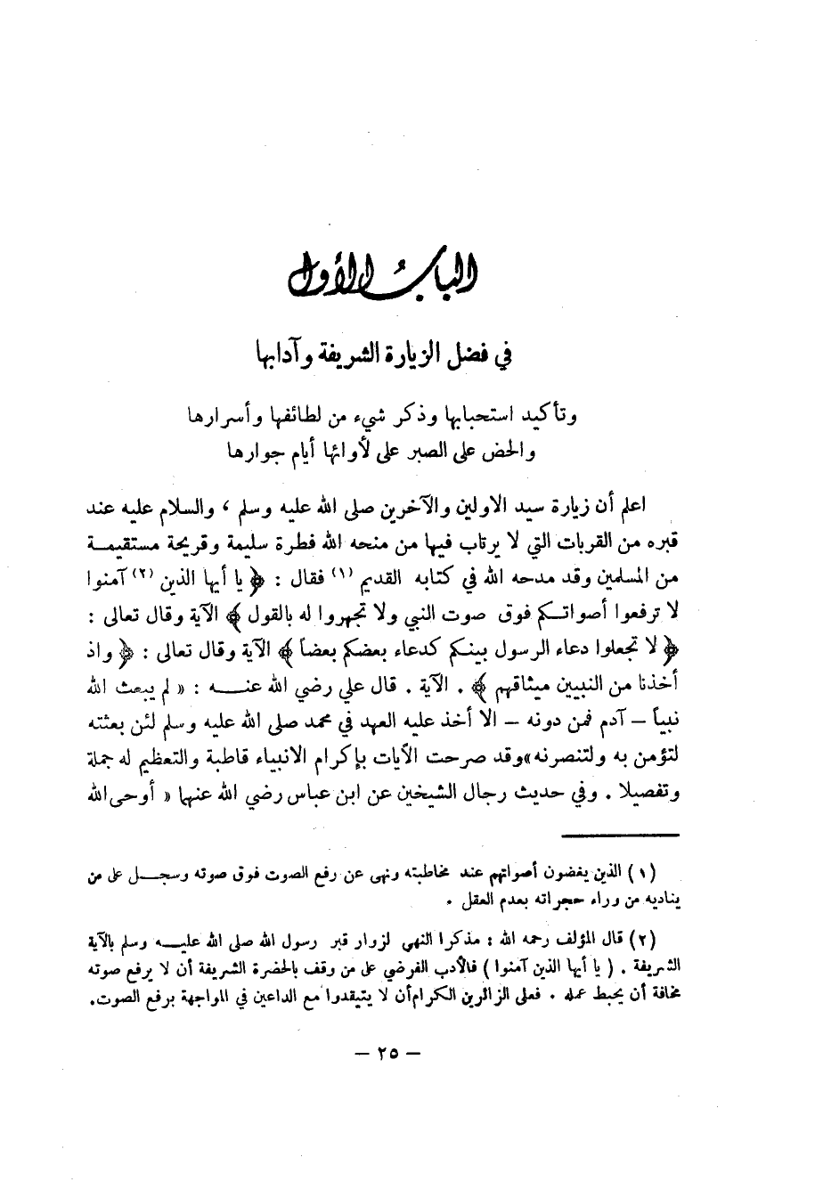 اعلم أن زيارة سيد الاولين والآخرين صلى الله عيله وسلم، والسلام عليه عند قبره من القربات التي لا يرتاب فيها من منحه الله فطرة سليمة وقريحة مستقيمة من السملمين وقد مدحه الله في كتابه القديم (1) فقال: (يا أيها الذين (2) آمنوا لا ترفعوا أصواتكم فوق صوت النبي ولا تجهروا له بالقول) الآية وقال تعاليى: (لا تجعلوا دعاء الرسول بينكم كدعاء بعضكم بعضاً) الآية وقال تعالى: (واذا أخذنا من النبيين ميثاقهم). الآية.