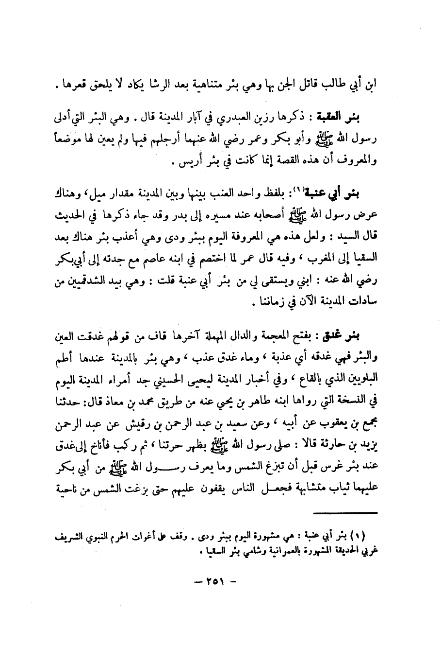 (1) بئر أبي عنبة: هي مشهورة اليوم ببئر ودى. وقف على أغوات الحرم النبوي الشريف غربي الحديقة المشهورة بالعمرانية وشامي بئر السقيا.