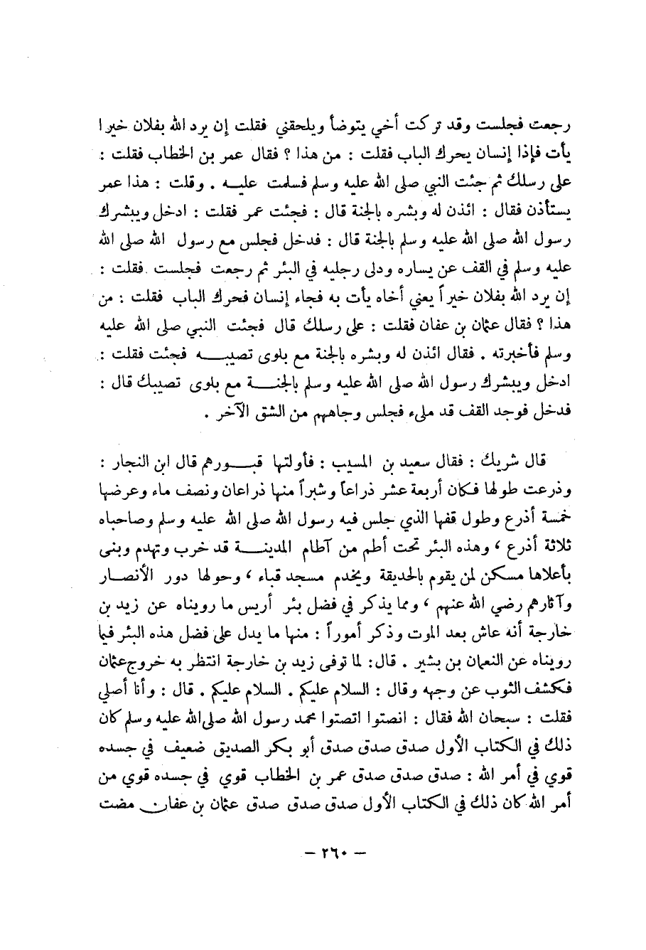 260 ... رجعت فجلست وقد تركت أخي يتوضأ ويلحقني فقلت إن يرد الله يفلان خيرا يأت فإذا إنسان يحرك الباب فقلت: من هذا؟ فقال عمر بن الخطاب فقلت: على رسلك ثم جئت النبي صلى الله عليه وسلم فسلمت عليه.