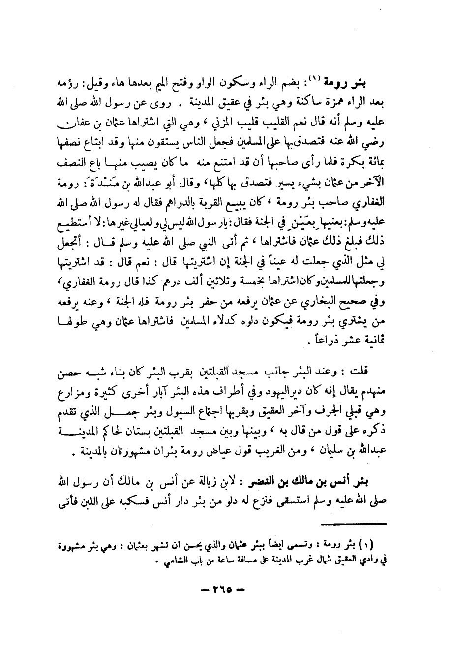 بئر رومة (1): بضم الراء وسكون الواو وفتح الميم بعدها هاء وقيل: رؤْمة بعد اراء همة ساكنة وهي بئر في عقيق المدينة.
