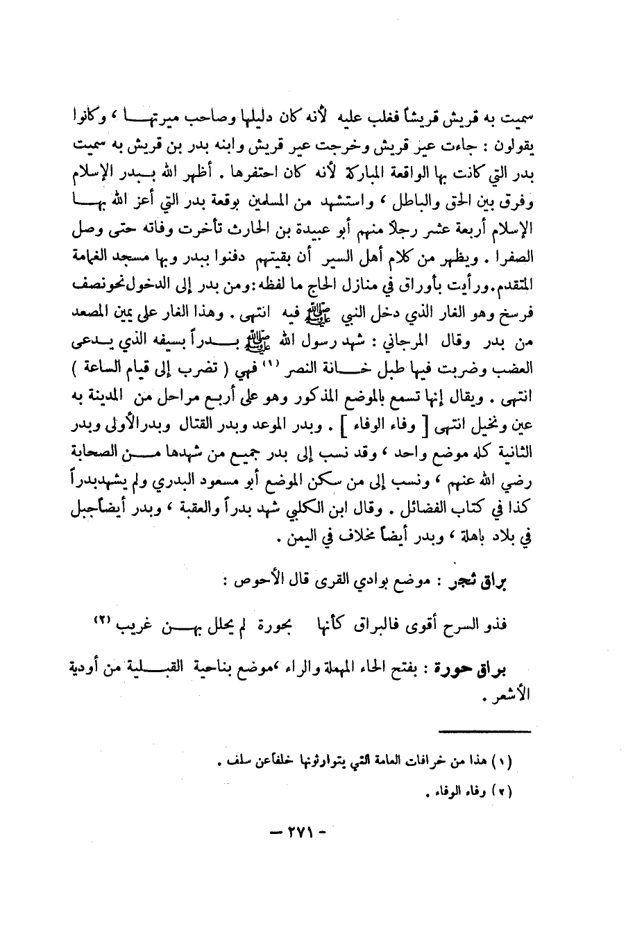 271 ... سميت به قريش قريشاً فغلب عليه لأنه كان دليلها وصاحب ميرتها، وكانواي قولون: جاءت عير قريش وخرجت عير قريش وابنه بدر بن قريش به سميت بدر التي كانت بها الواقعة المباركة لأنه كان احتفرها.