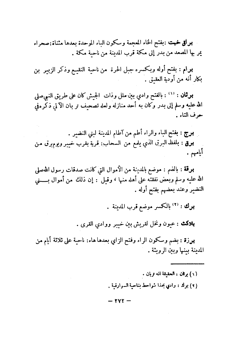 برثان: (1): بالفتح وادي بين ملل وذات الجيش كان على طريق النبي صلى الله عليه وسلم إلى بدر وكان به أحد منازله ولعله تصحيف تربان الآتي ذكره في حرف التاء.