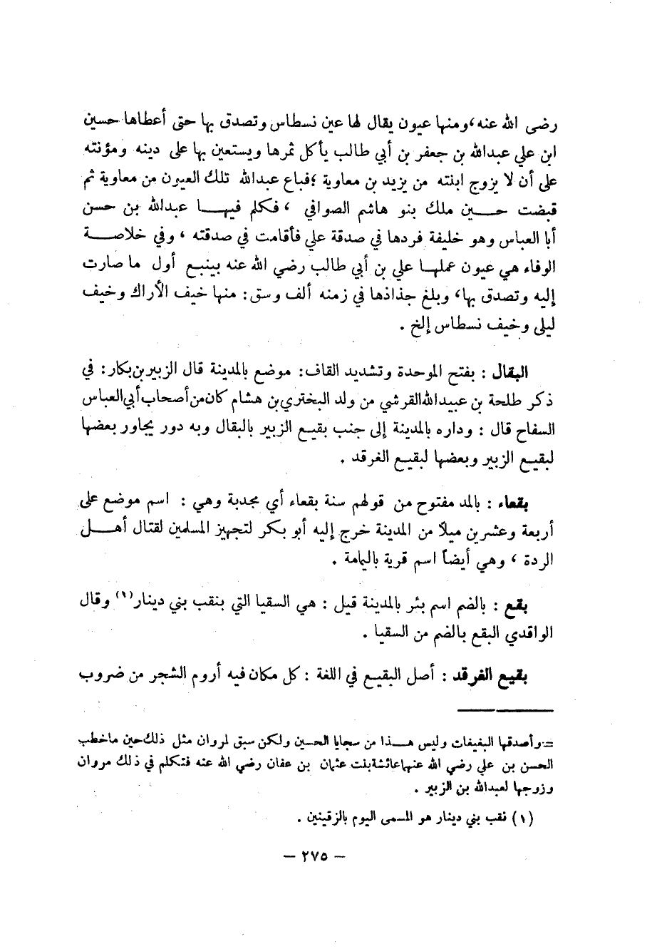 275 ... رضي الله عنه، ومنها عيون يقال لها عين نسطاس وتصدق بها حتى أعطاها حسين ابن علي عبد الله بن جعفر بن أبي طالب يأكل ثمرها ويستعين بها على دينه ومؤنته على أن لا يزوح ابنته من يزيد بن معاوية؛ فباع عبد الله تلك العيون من معاوية ثم قبضت حين ملك بنو هاشم الصوافي، فكلم فيها عبدالله بن حسن أبا العباس وهو خليفة فردها في صدقة علي فأقامت في صدقته، وفي خلاصة الوفاء هي عيون عملها علي بن أبي طالب رضي الله عنه بينبع أول ما صارت إليه وتصدق بها، وبلغ جذاذها في زمنه ألف وسق: منها خيف الأراك وخيف ليلى وخيف نسطاس إلخ.