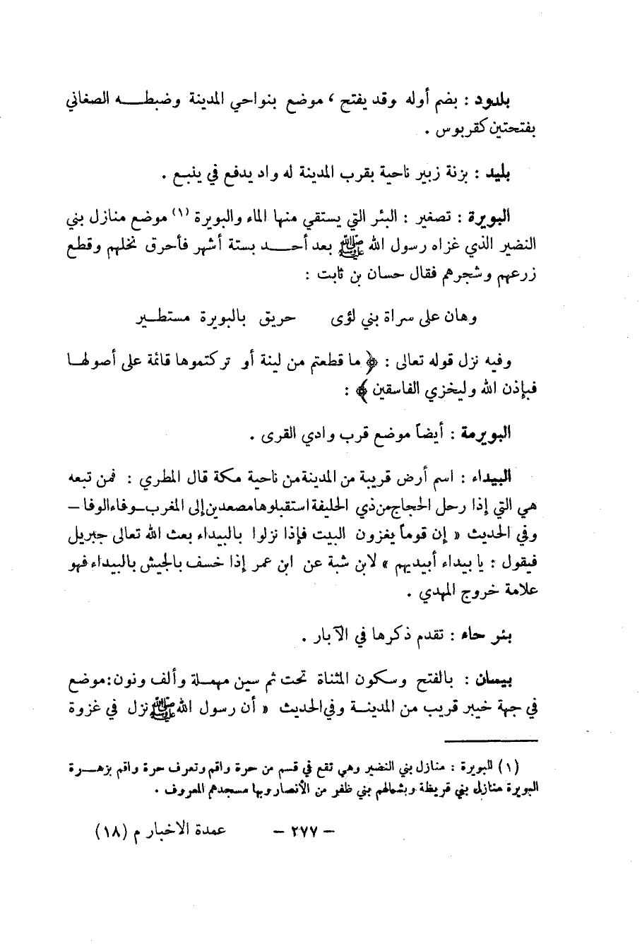 (1) البويرة: منازل بني النضير وهي تقع في قسم من حرة واقم وتعرف حرة واقم بزهرة البويرة منازل بني قريظة بني ظفر من الأنصار وبها مسجدهم المعروف.