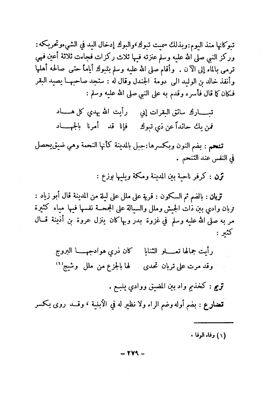 279 ... تبوكانها منذ اليوم: وبذلك سميت تبوك، والبوك إدخال اليد في الشيء وتحريكه: وركز النبي صلى الله عليه وسلم عنزته فيها ثلاث ركزات فجاءت ثلاثة أعين فهي ترمى بالماء إلى الآن.