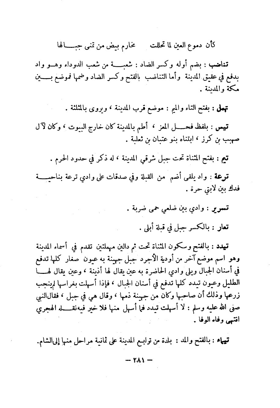 تيدد: بالفتح وسكون المثناة تحت ثم دالين مهملتين تقدم في أسماء المدينة وهو اسم موضع آخر من أودية الأجرد جبل جهينة به عيون صغار كلها تدفع في أسنان الجبال ويلى وادي الحاضرة به عيني قال لها أذينة، وعين يقال لها الطليل وعيون تيدد كلها تدفع في أسنان الجبال، فإذا أسهلت بغراسها لم ينجب زرعها وذلك أن صاحبها وكان من جهينة ذمها، وقال هي في جبل، فقال النبي صلى الله عليه وسلم: لا أسلهت تيدد فما اسهل منها فلا خير فيه نقله الهجري انتهى وفاء الوفا.