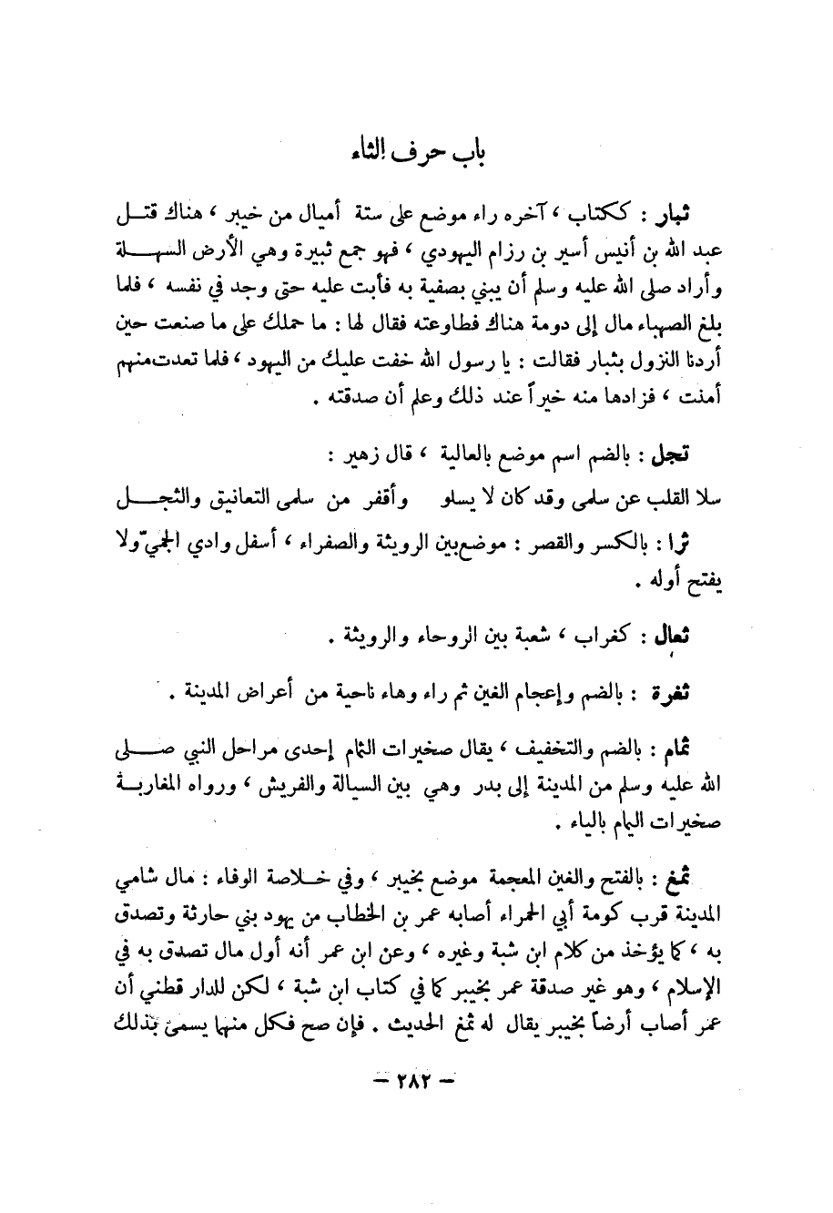 ثبار: ككتاب، آخره راء موضع على ستة أميال من خيبر، هناك قتل عبد الله بن أنيس أسير بن رزام اليهودي، فهو جمع ثبيرة وهي الأرض السهلة وأراد صلى الله عليه وسلم أن يبني بصفية به فأبت عليه حتى وجد في نفسه، فلما بلغ الصهباء مال إلى دومة هناك فطاوعته فقال لها: ما حملك على ما صنعت حين أردنا النزول بثبار فقالت: يا رسول الله خفت عليك من اليهود، فلما تعدت منهم أمنت، فزادها منه خبراً عند ذلك وعلم أن صدقته.