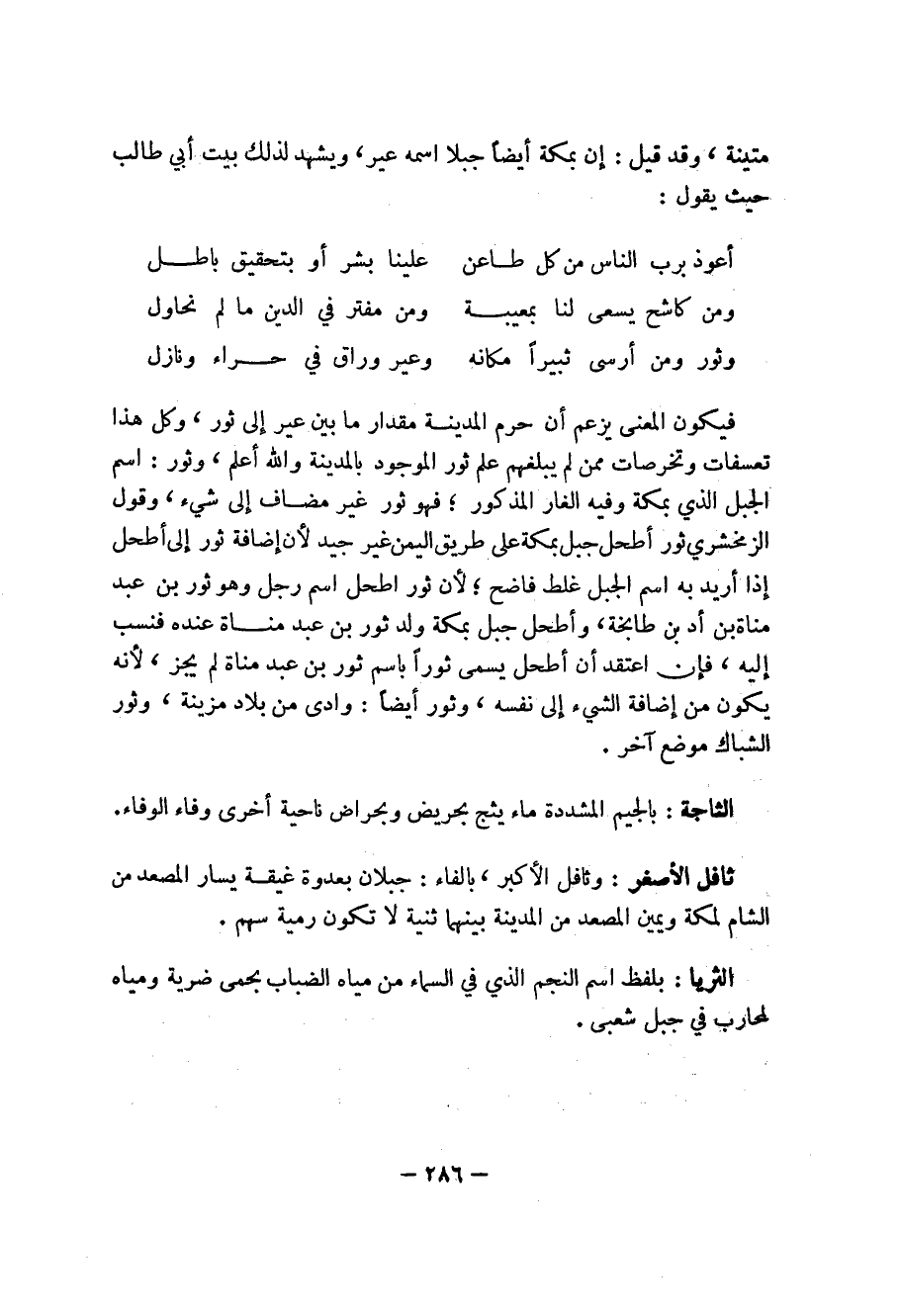 فيكون المعنى يزعم أن حرم المدينة مقدار ما بين عير إلى ثور، وكل هذا تعسفات وتخرصات ممن لم يبلغهم علم ثور الموجودب المدينة والله أعلم، وثور: اسم الجيل الذي بمكة وفيه الغار المذكور؛ فهو ثور غير مضاف إلى شيء، وقول الزمخشري ثور أطحل بمكة على طريق اليمن غير جيد لأن إضافة ثور إلى أطحل إذا أريد به اسم الجبل غلط فاضح؛ لأن ثور اطحل اسم رجل وهو ثور بن عبد مناة أد بن طابخة، وأطحل جبل بمكة ولد ثور بن عبد مناة عنده فنسب إليه، فإن اعتقد أن أطحل يسمى ثوراً باسم ثور بن عبد مناة لم يجز، لأنه يكون من إضافة الشيء إلى نفسه، وثور أيضاً: وادى من بلاد مزينة، وثور الشباك موضع آخر.