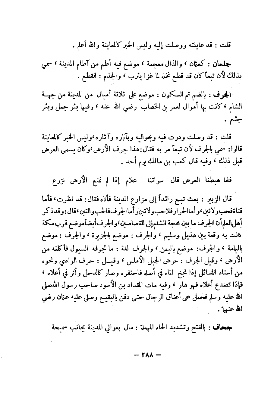 قال الزبير: بعث تبع رائداً إلى مزارع المدينة فأتاه فقال: قد نظرت، فأما قناة فحب ولاتبن، وأما الحرار فلا حب ولاتبن وأما الجرف فالحب والتبن، قال: وقد ذكر أهل العلم أن الجرف ما بين محجة الشام إلى القصاصين، والجرف أيضاً موضع قرب مكة كانت به وقعة بين هذيل وسليم، والجرف: موضع بالجزيرة، والجرف: موضع باليمامة، والجرف: موضع باليمن، والجرف لغة: ما تجرفه السيول فأكلته من الأرض، وقيل الجرف: عرض الجبل الأملس، وقيل: حرف الوادي ونحوه من أسناد المسائل إذا نجخ الماء في أصله فاحتفره وصار كالدحل وأثر في أعلاه، فإذا تصدع أعلاه فهو هار، وفيه مات المقداد بن الأسود صاحب رسول الله صلى الله عليه وسلم فحمل على أعناق الرجال حتى دفن بالبقيع وصلى عليه عثمان رضي الله عنهما.