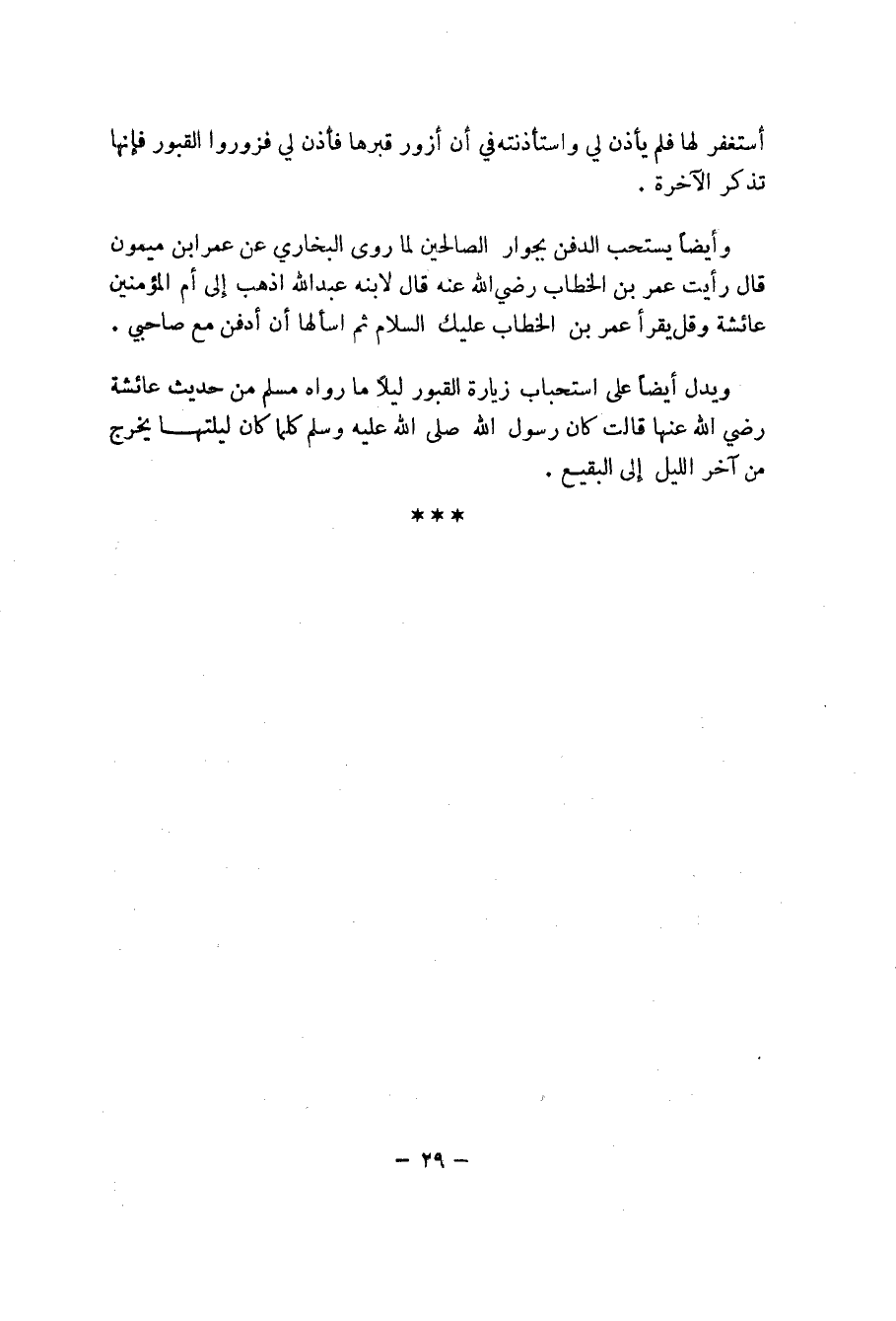 ويدل أيضاً على استحباب زيارة القبور ليلاً ما رواه مسلم من حديث عائشة رضي الله عنها قالت كان رسول الله صلى الله عليه وسلم كلما كان ليلتها يخرج من آخر الليل إلى البقيع.