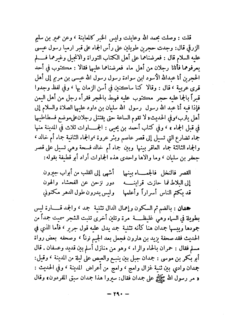 290 ... قلت: وصلت بحمد الله وعاينت وليس الخبر كالمعاينة، وعن عمير بن سليم الزرقي قال: وجدت حجرين طويلين على رأس الجماء على قبر ارميا رسول عيسى عليه السلام قال: فعرضناهما على أهل الكتاب التوراة والانجيل وغيرهما فلم يعرفونهما فأتانا رجلان من أهل ماه فعرضناهما عليهما فقالا: مكتوب في أحد الحجرين أنا عبدالله الأسود ابن سوادة رسول الله عيسى بن مريم إلى أهل قرى عربية، قال: وقالا كنا ساكنين في أسن الزمان بها، وفي لفظ وجدوا قبراً بالجما عليه حجر مكتوب عليه فهبط بالحجر فقرأه رجل من أهل اليمن فإذا فيه أنا عبد الله رسول الله سليمان بن دواود عليهما السلام الصلاة والسلام إلى أهل يثرب، وفي الحديث (لا تقوم الساعة حتى يقتتل رجلان على موضع فسطاطيهما في قبل الجماء)، وفي كتاب أحمد بن يحيى: الجماوات ثلاث في المدينة منها جماء تضارع التي تسيل إلى قصر عاصم وبئر عروة، والجماء الثانية جماء أم خالد، والجماء الثالثة جماء العاقر بينها وبين جماء أم خالد فسحة وهي تسيل على قصر جعفر بن سليمان، وما والاها واحدى هذه الجماوات أراد أبو قطيفة بقوله:
