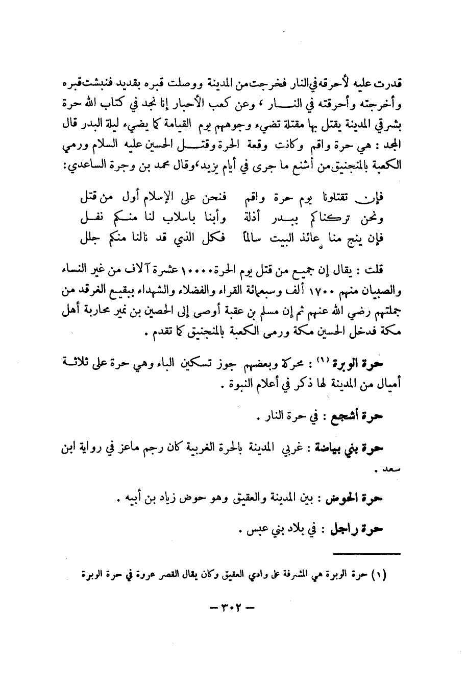 302 ... قدرت عليه لأحرقه في النار فخرجت من المدينة ووصلت قبره بقديد فنبشت قبره وأخرجته وأحرقته في النار، وعن كعب الأحبار إنا نجد في كتاب الله حرة بشر في المدينة يقتل بها مقتلة تضيء وجوههم يوم القايمة كما يضيء ليلة البدر قال المجد: هي حرة واقم وكانت وقعة الحرة وقتل الحسين عليه السلام ورمي الكعبة بالمنجنيق من أشنع ما جرى في أيام يزيد، وقال محمد بن وجرة الساعدي: